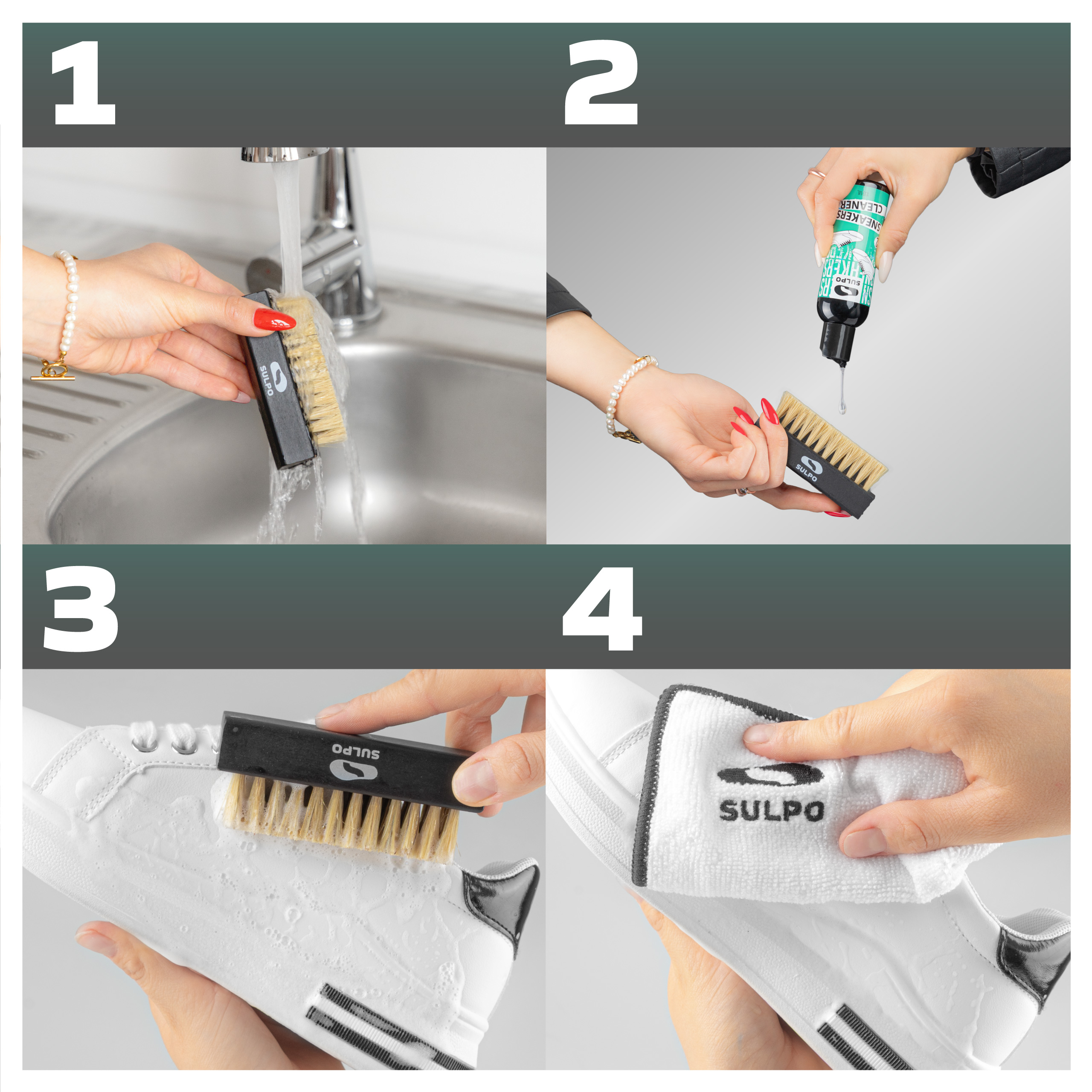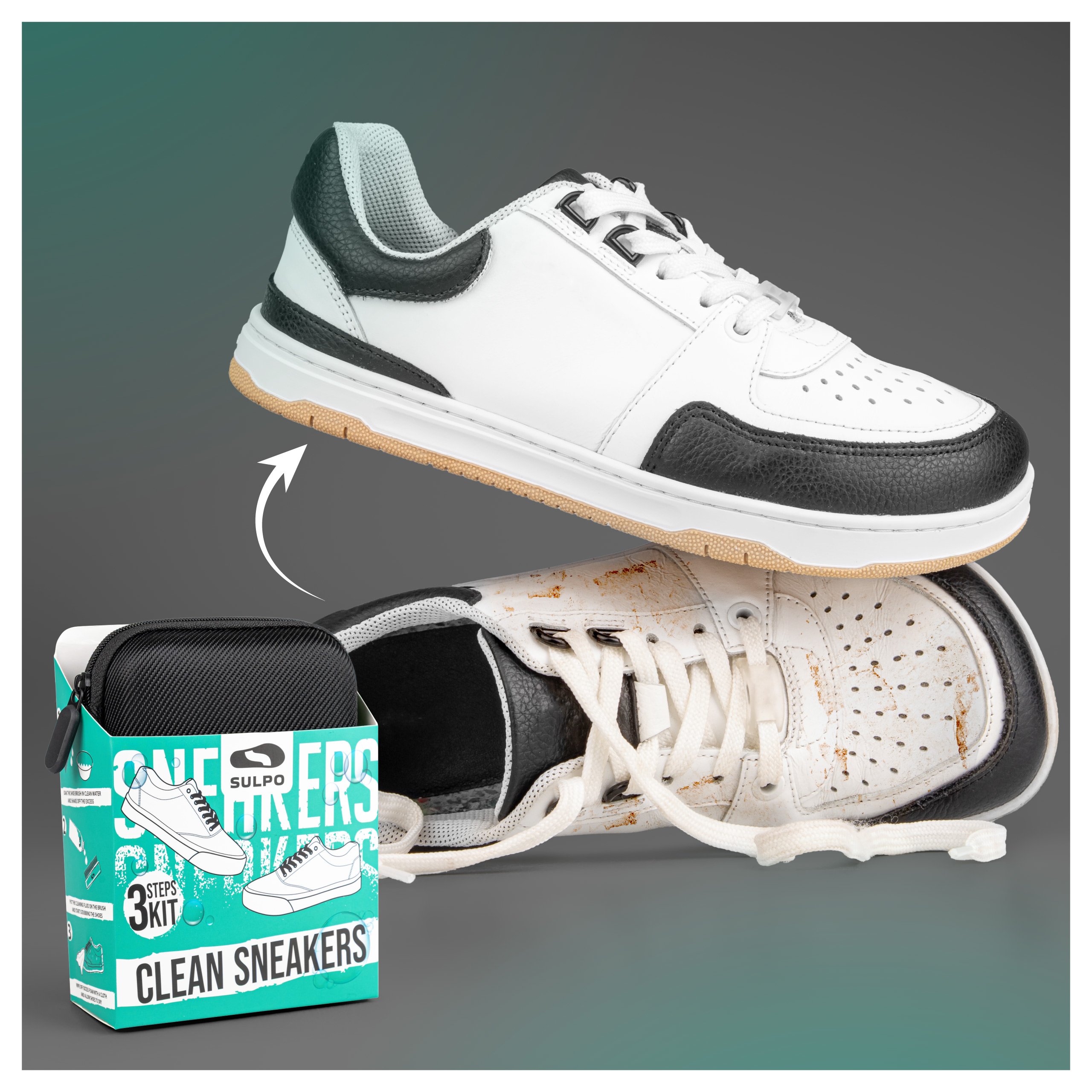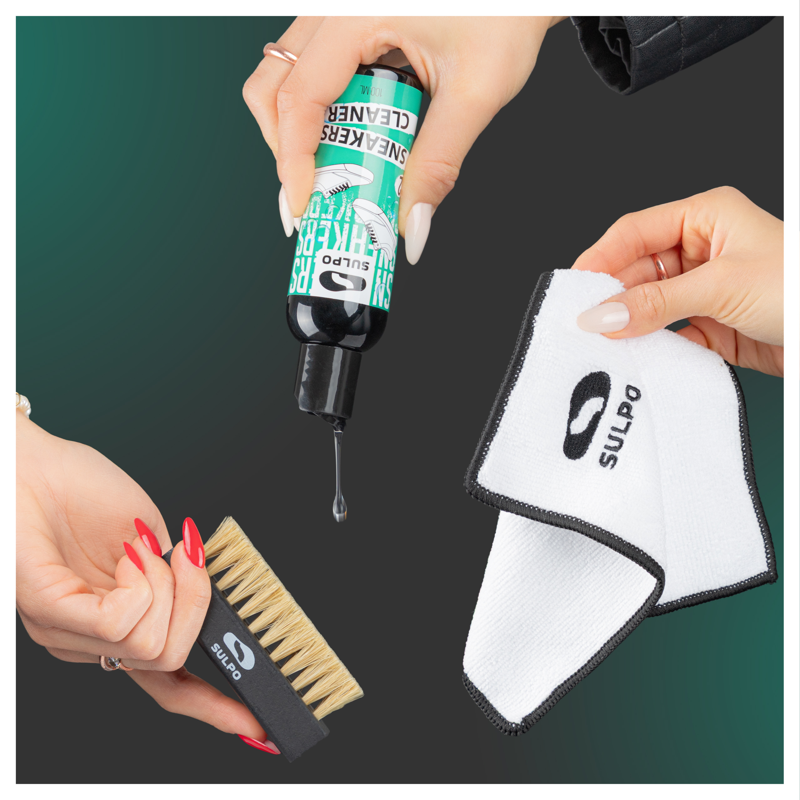 - Zestaw SULPO to wygodne rozwiązanie do czyszczenia sneakersów – zawiera płyn, szczotkę i mikrofibrę, działa skutecznie na skórę, zamsz, canvas, mesh i inne materiały, nie niszcząc ich.