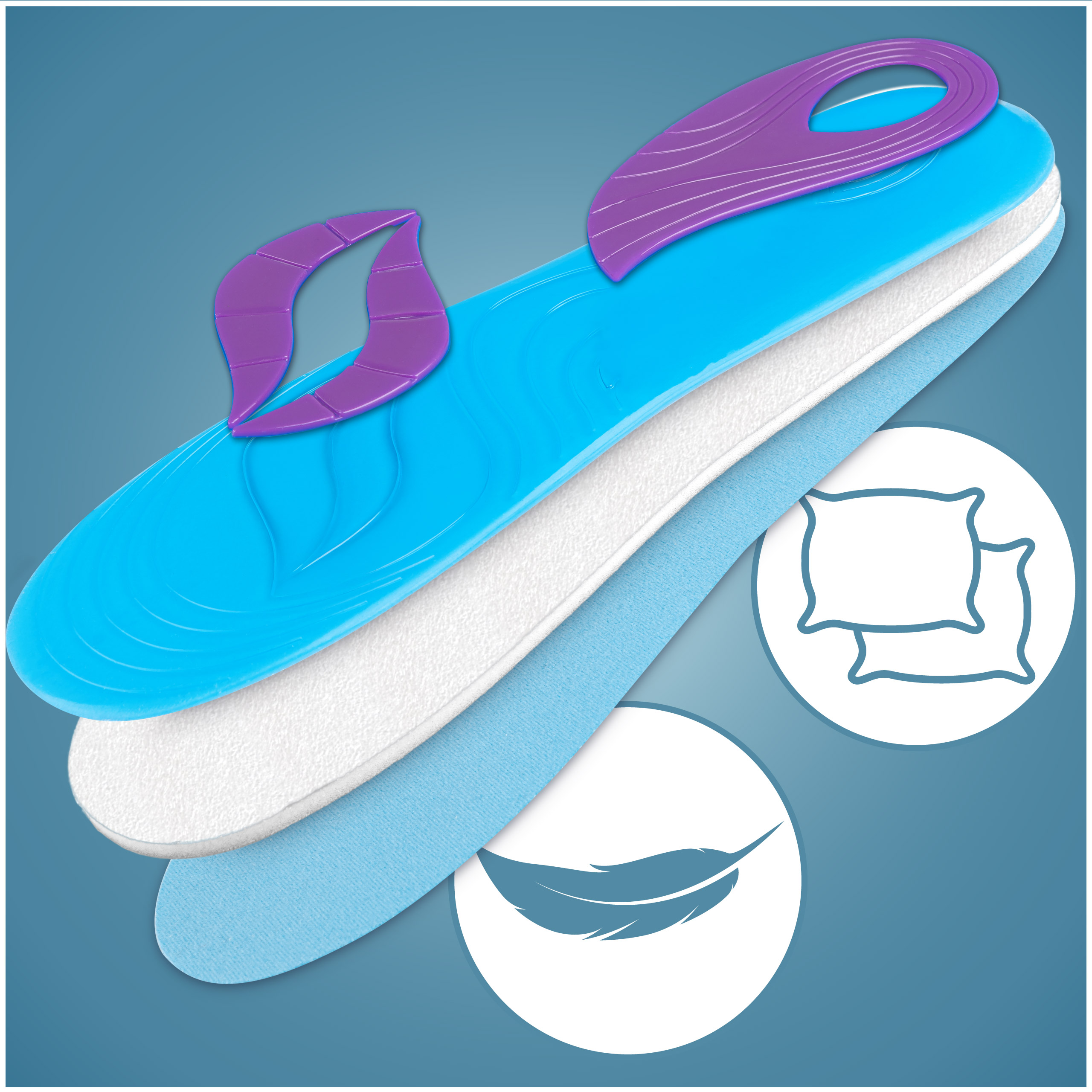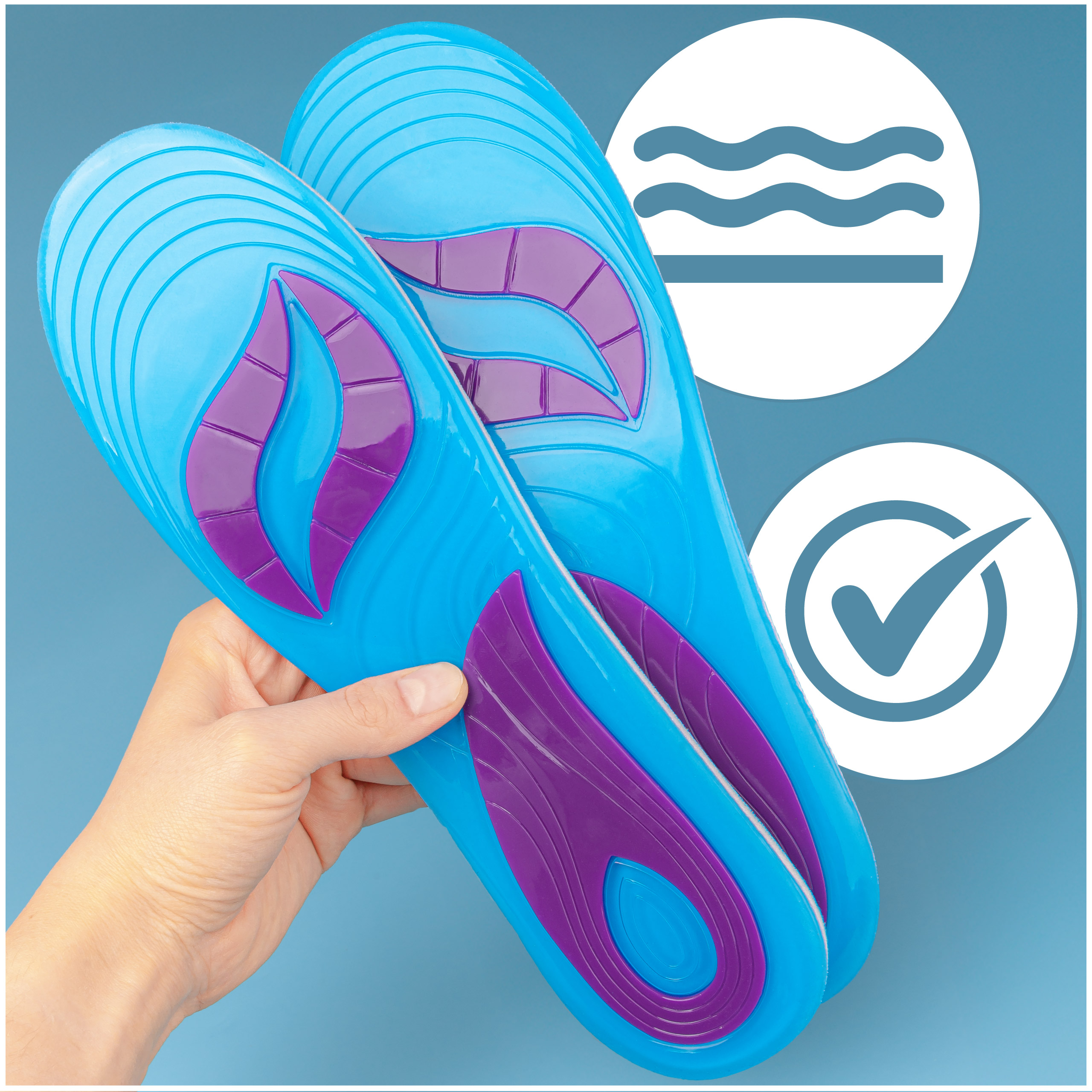 - Żelowe wkładki z pianką memory to uniwersalne rozwiązanie zapewniające komfort, amortyzację i dopasowanie dla zmęczonych stóp – idealne do każdego rodzaju obuwia.