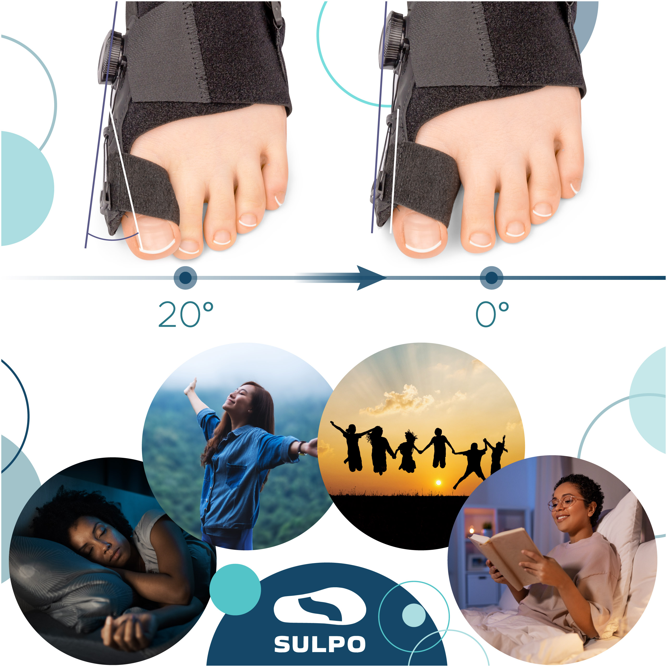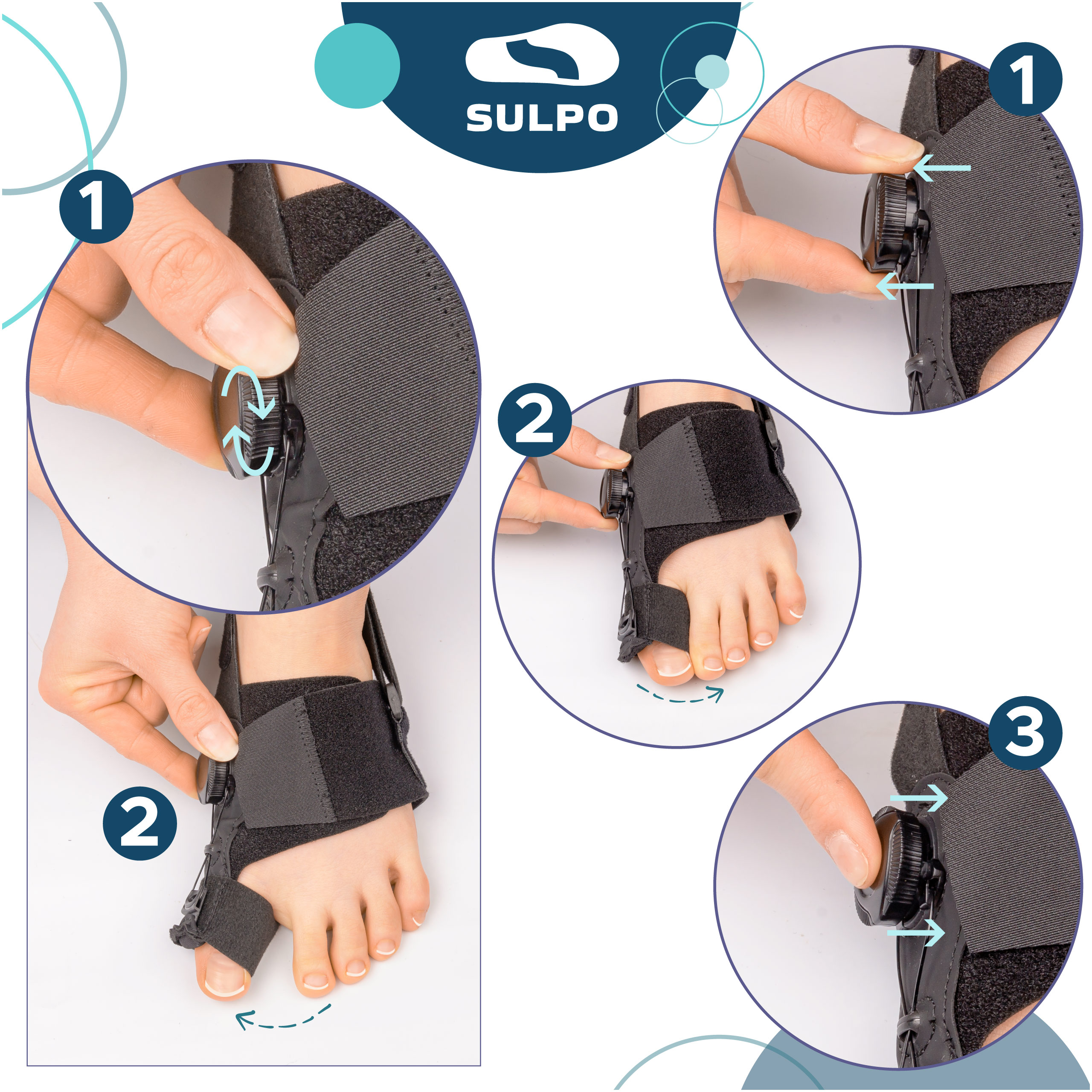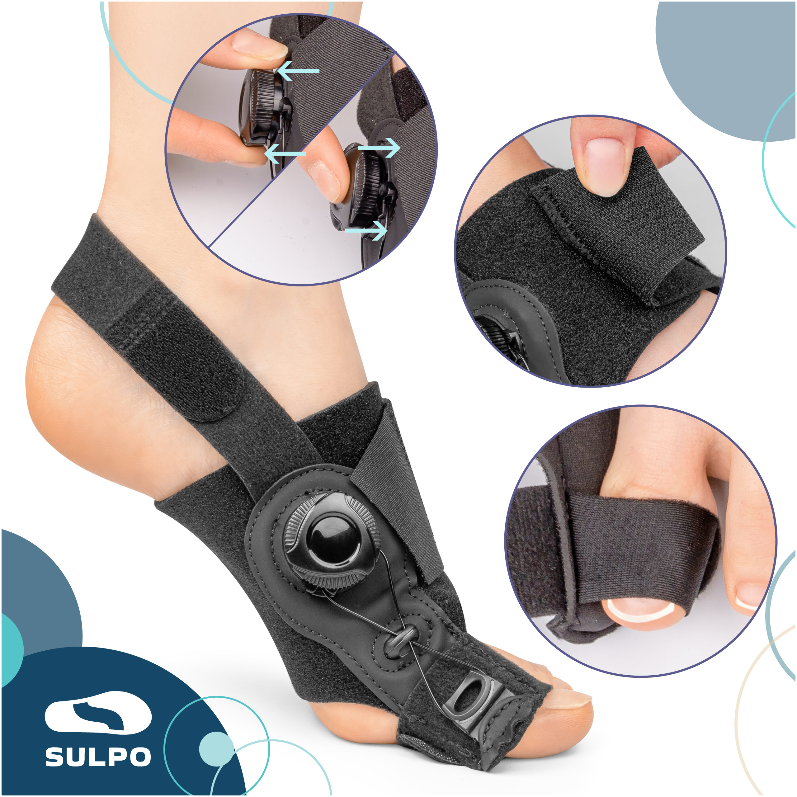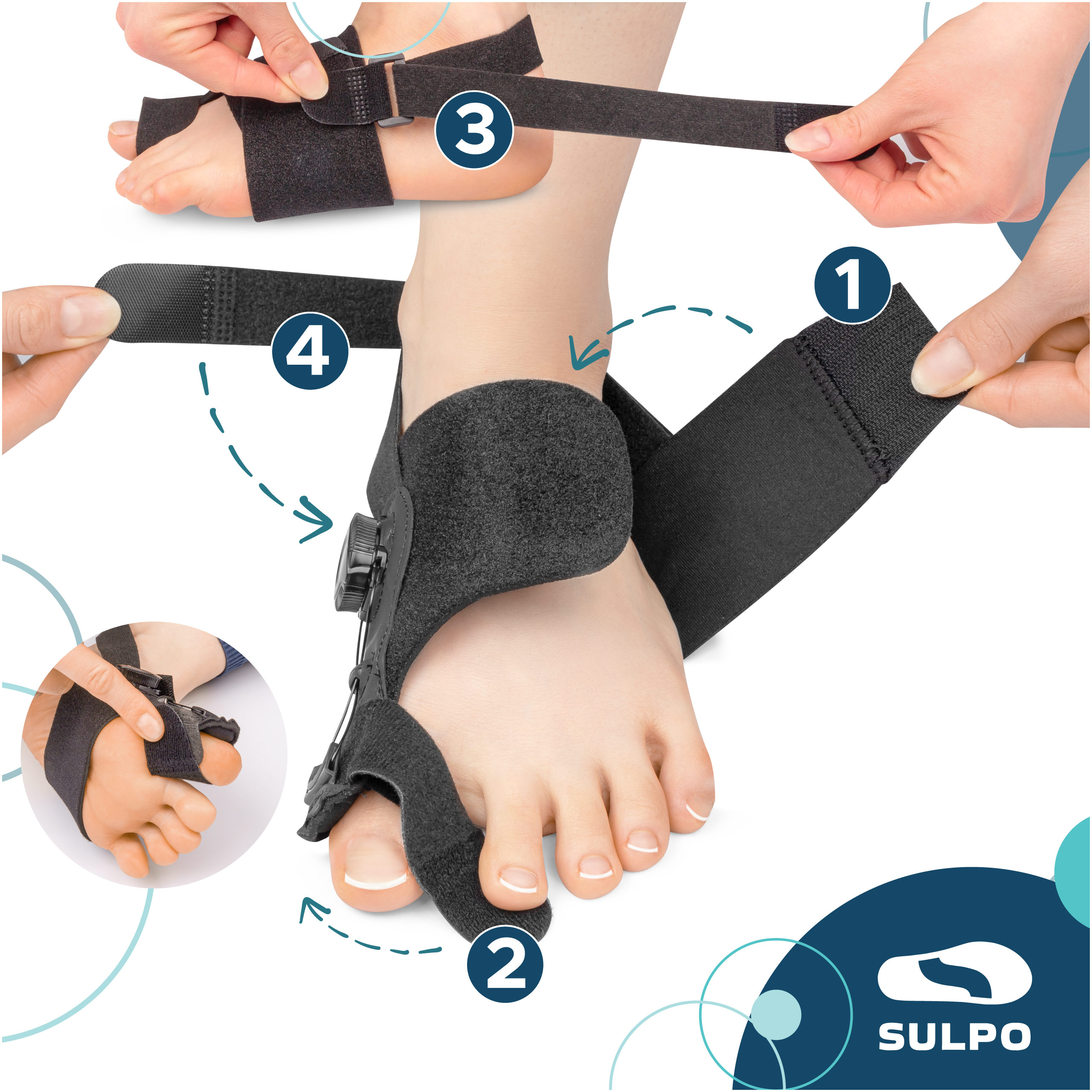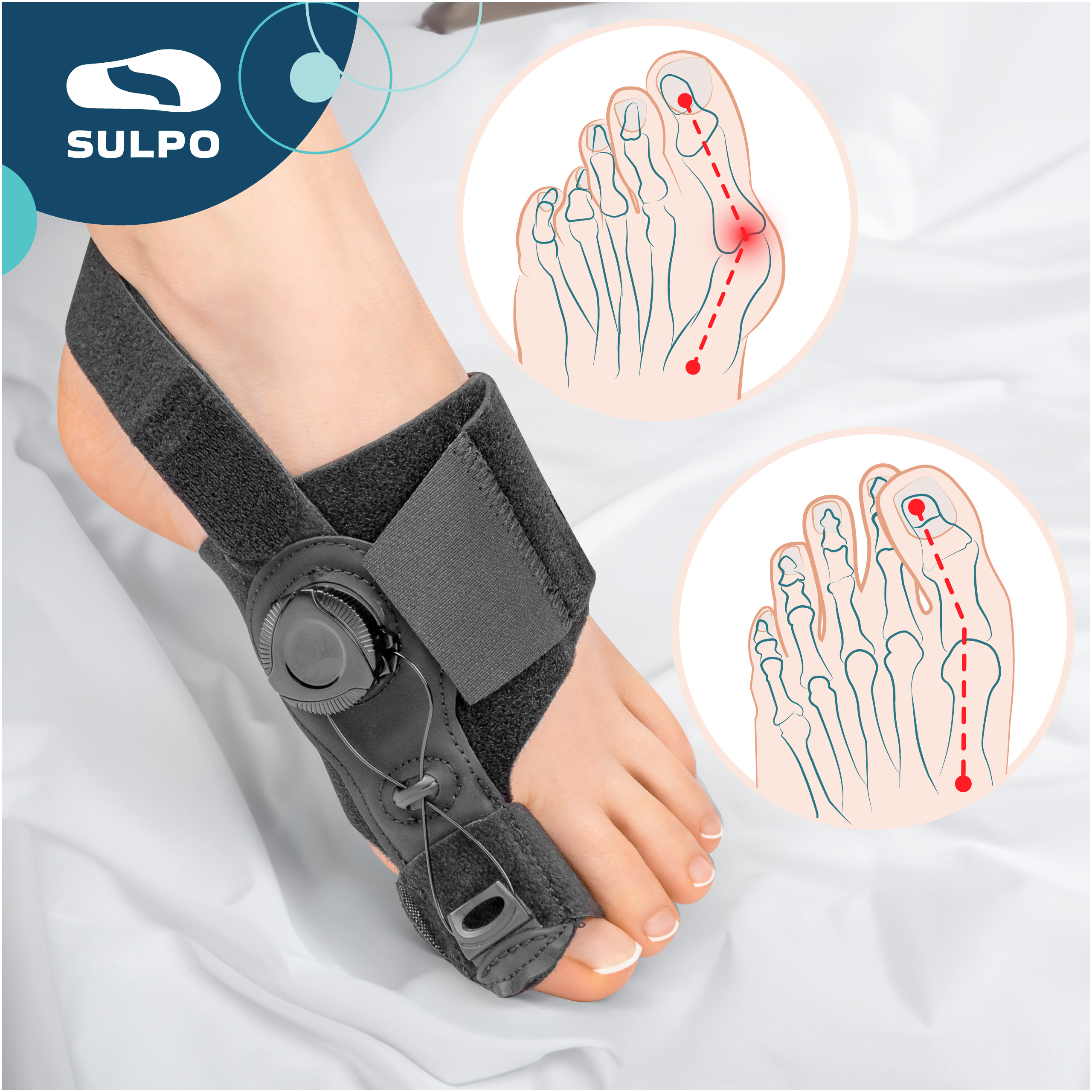 - Regulowany aparat korekcyjny na haluksy skutecznie prostuje paluch, łagodzi ból i poprawia komfort chodzenia.