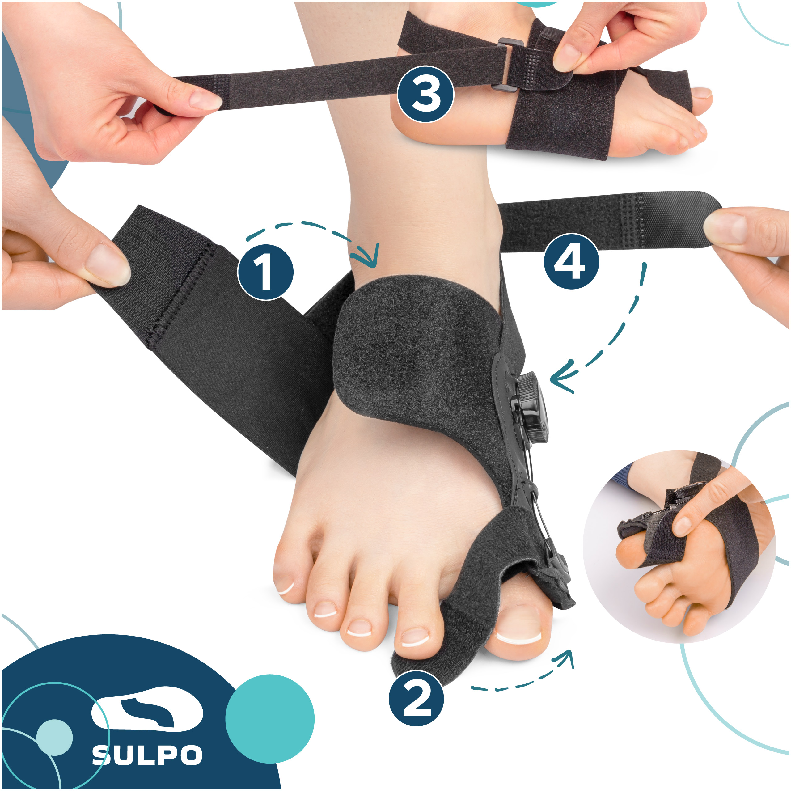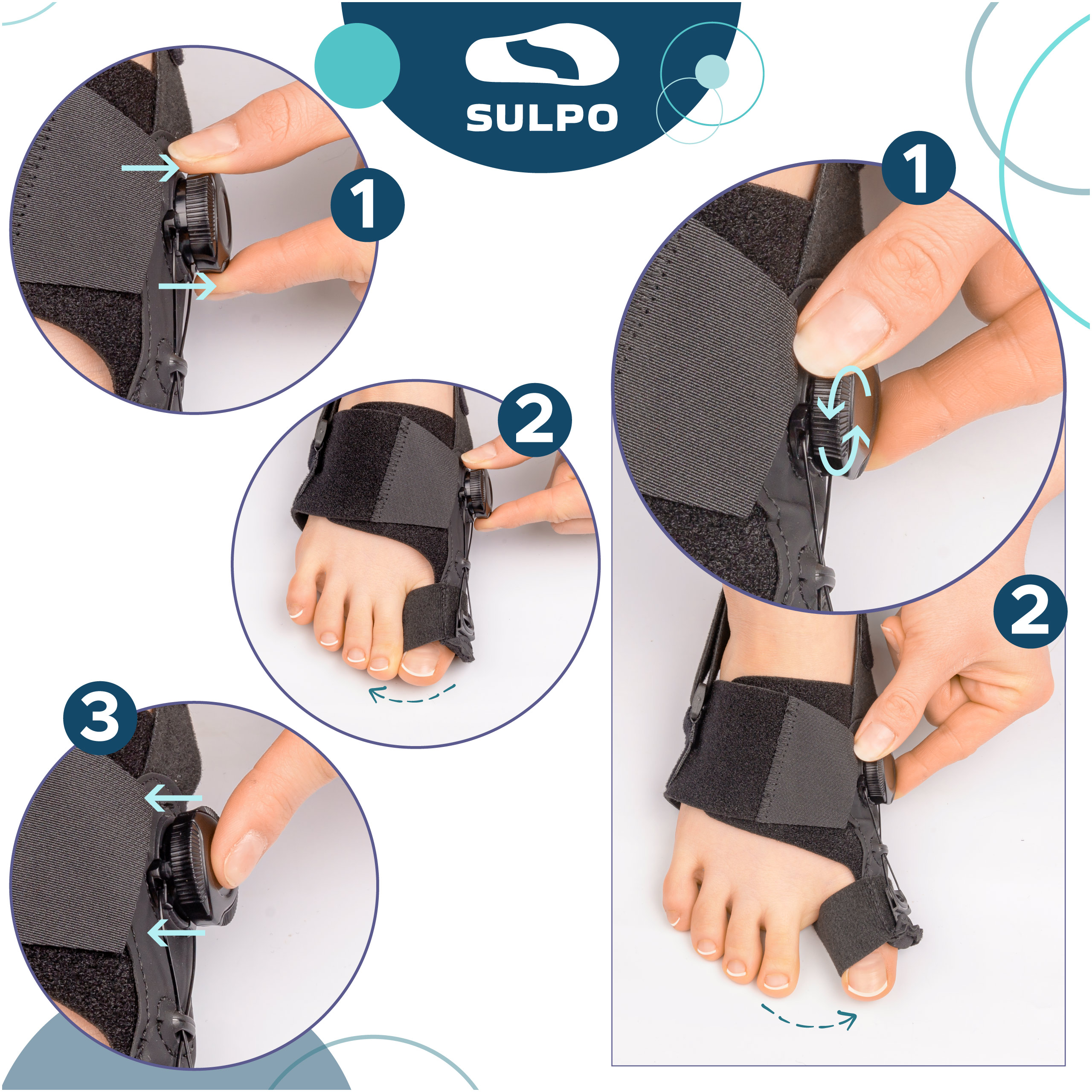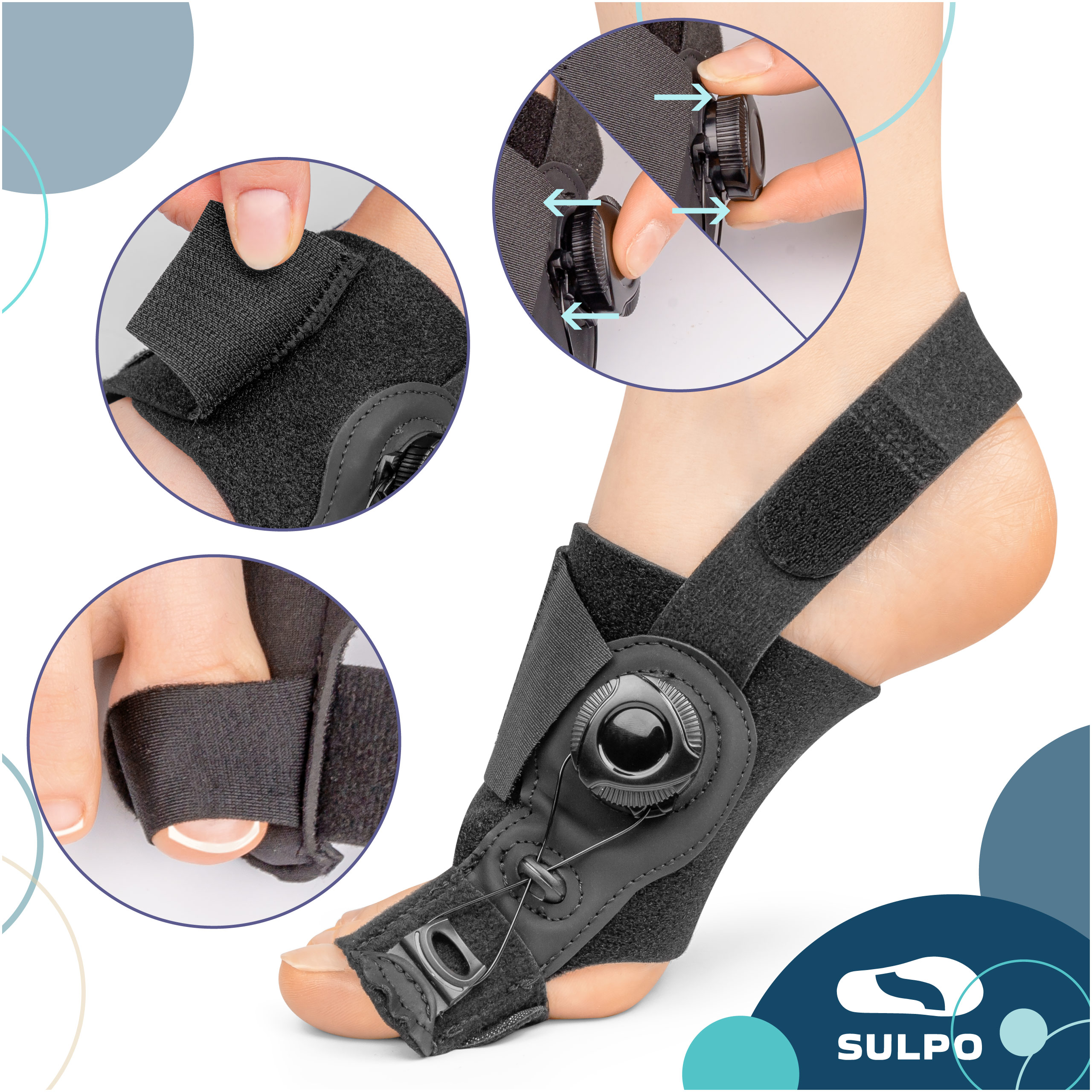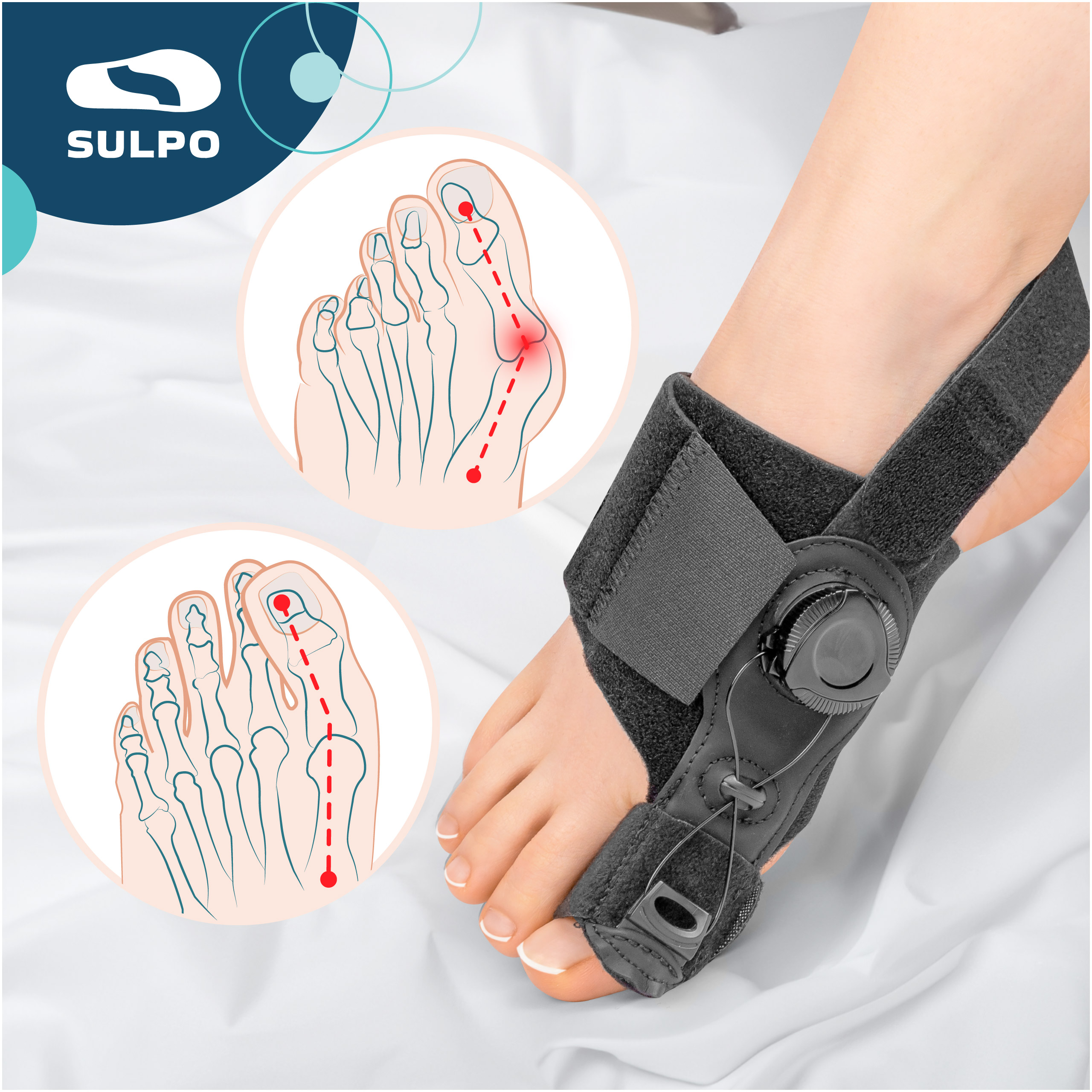 - Regulowany aparat korekcyjny na haluksy skutecznie prostuje paluch, łagodzi ból i poprawia komfort chodzenia.