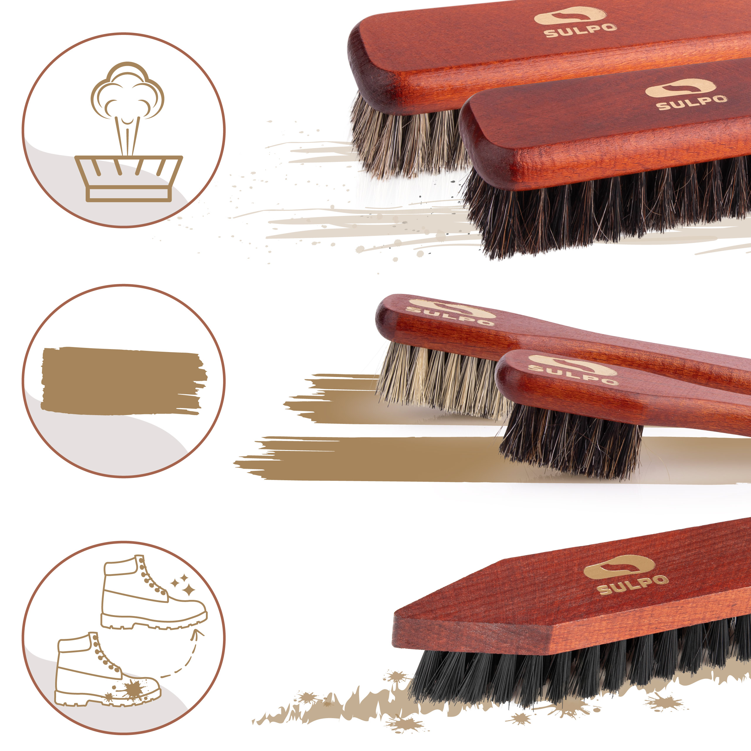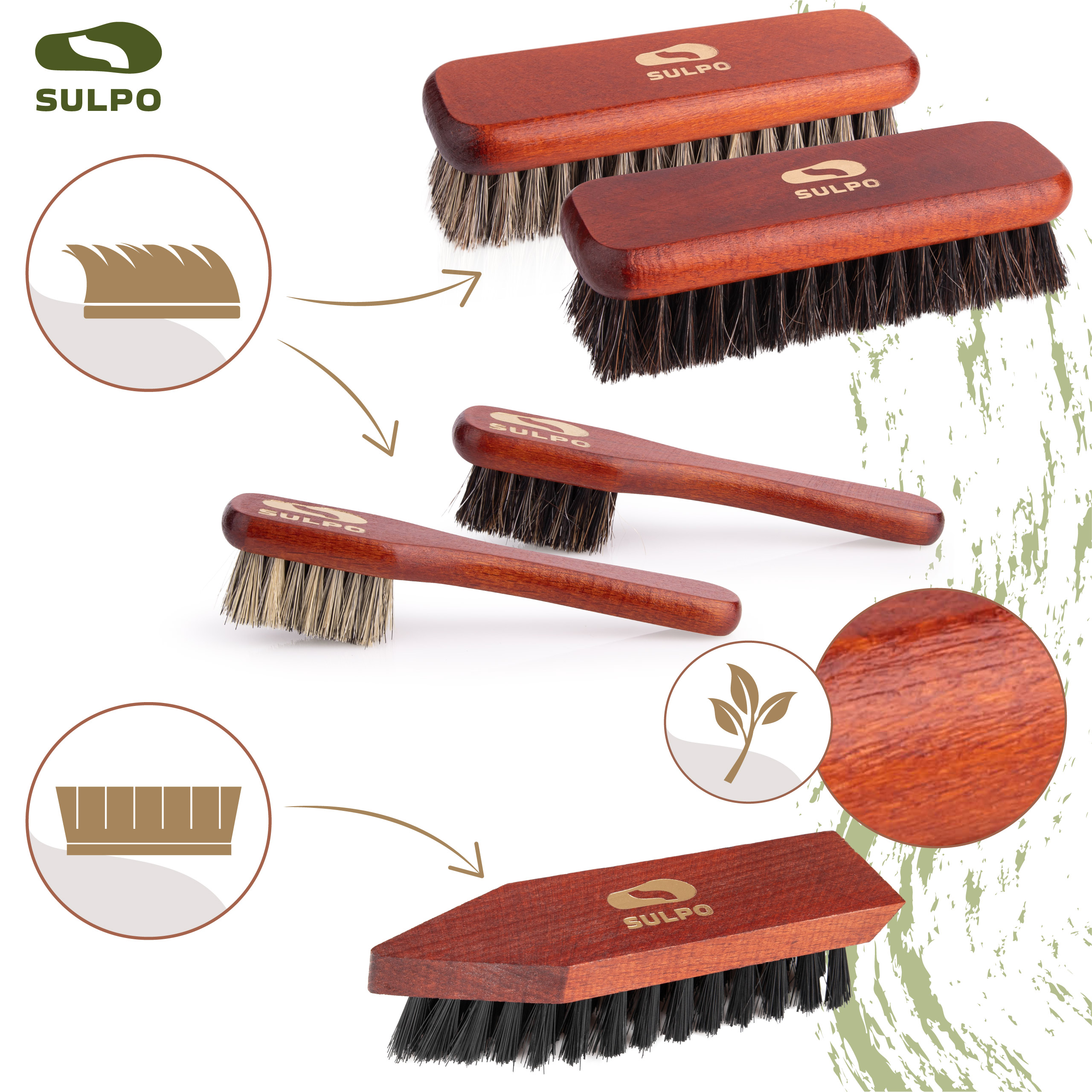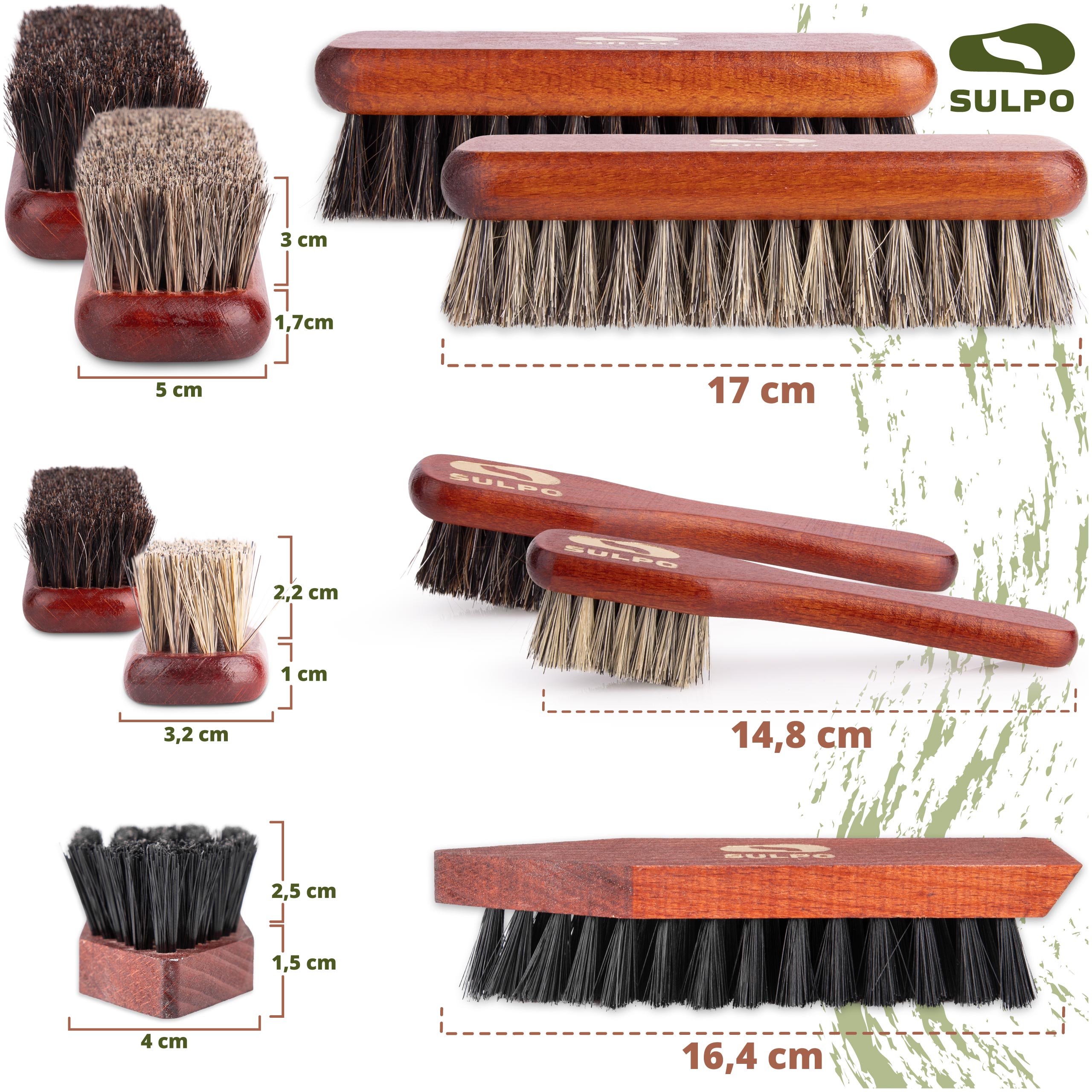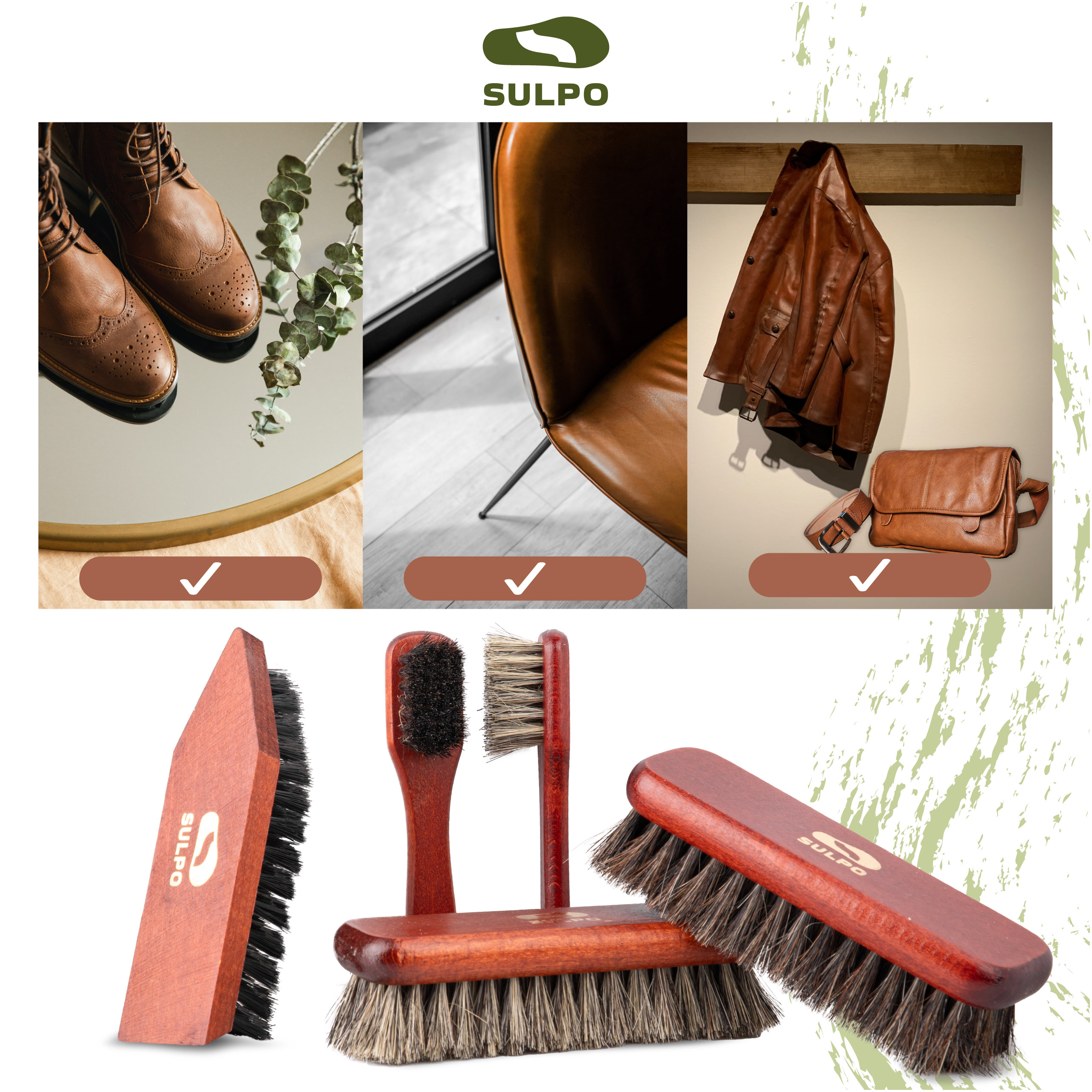 - Zestaw SULPO zawiera 3 szczotki z końskiego włosia (do polerowania, czyszczenia i usuwania zabrudzeń) oraz 2 mazaki do aplikacji past i kremów. Rękojeści wykonane z drewna bukowego, zestaw zapakowany w pudełko tekturowe.