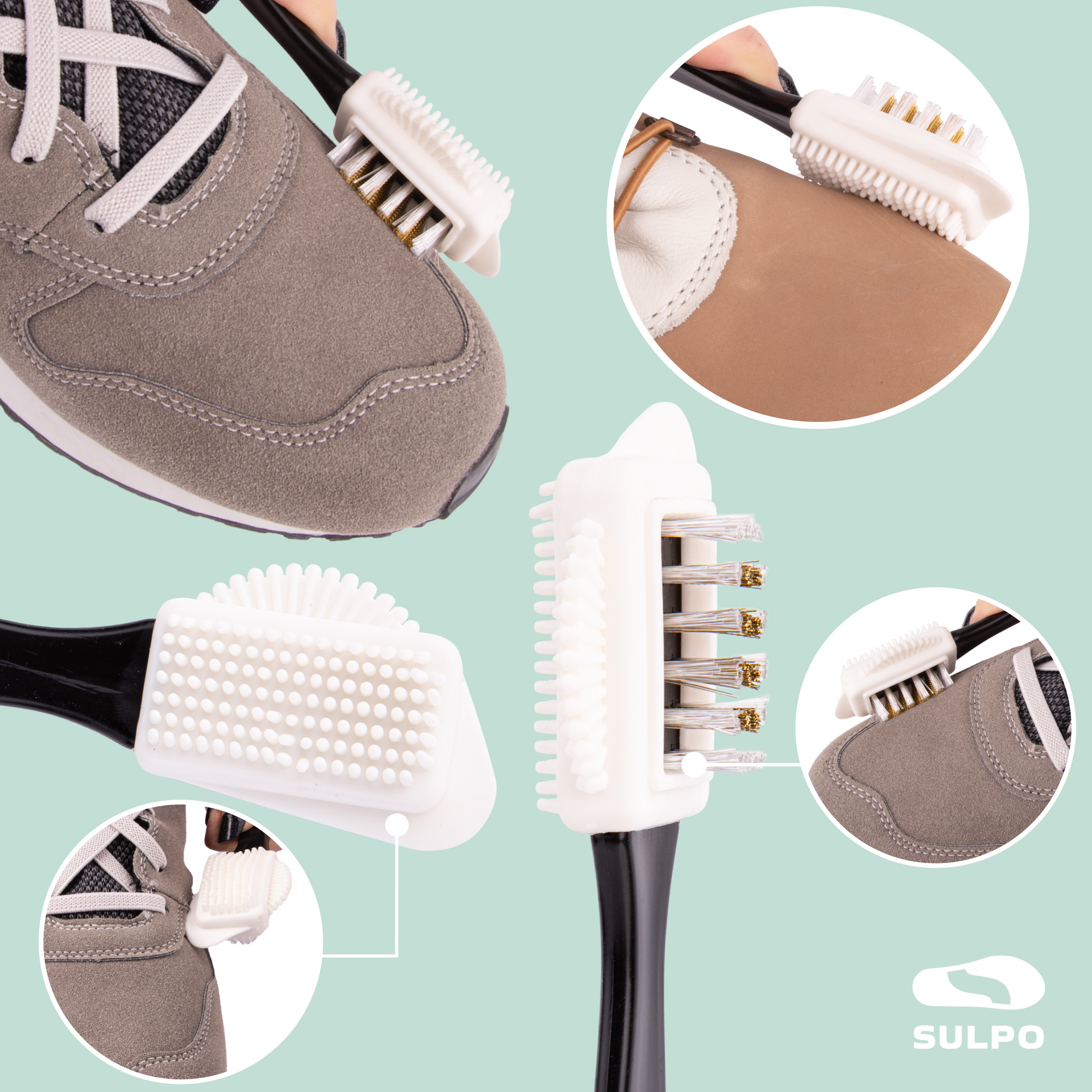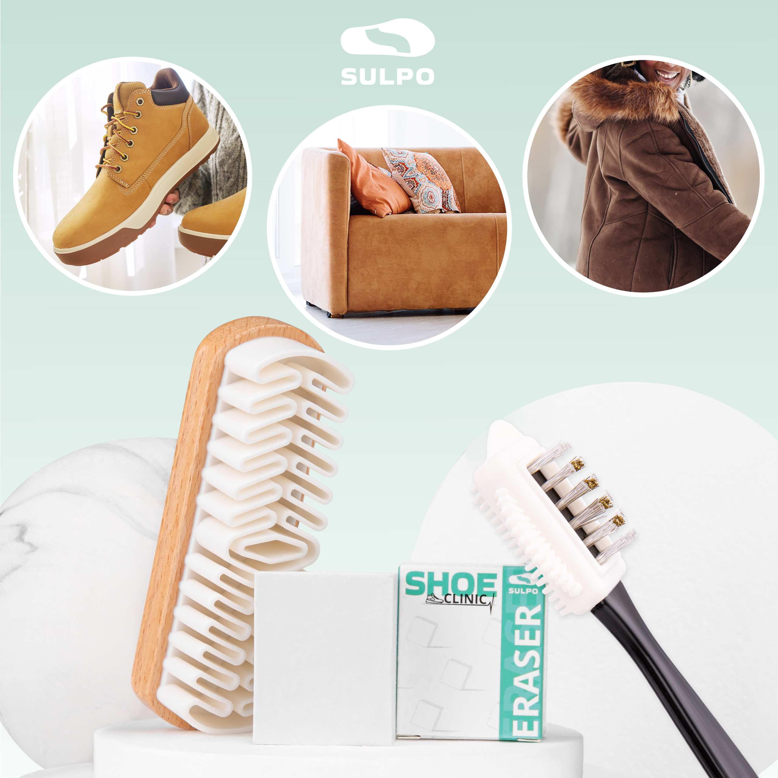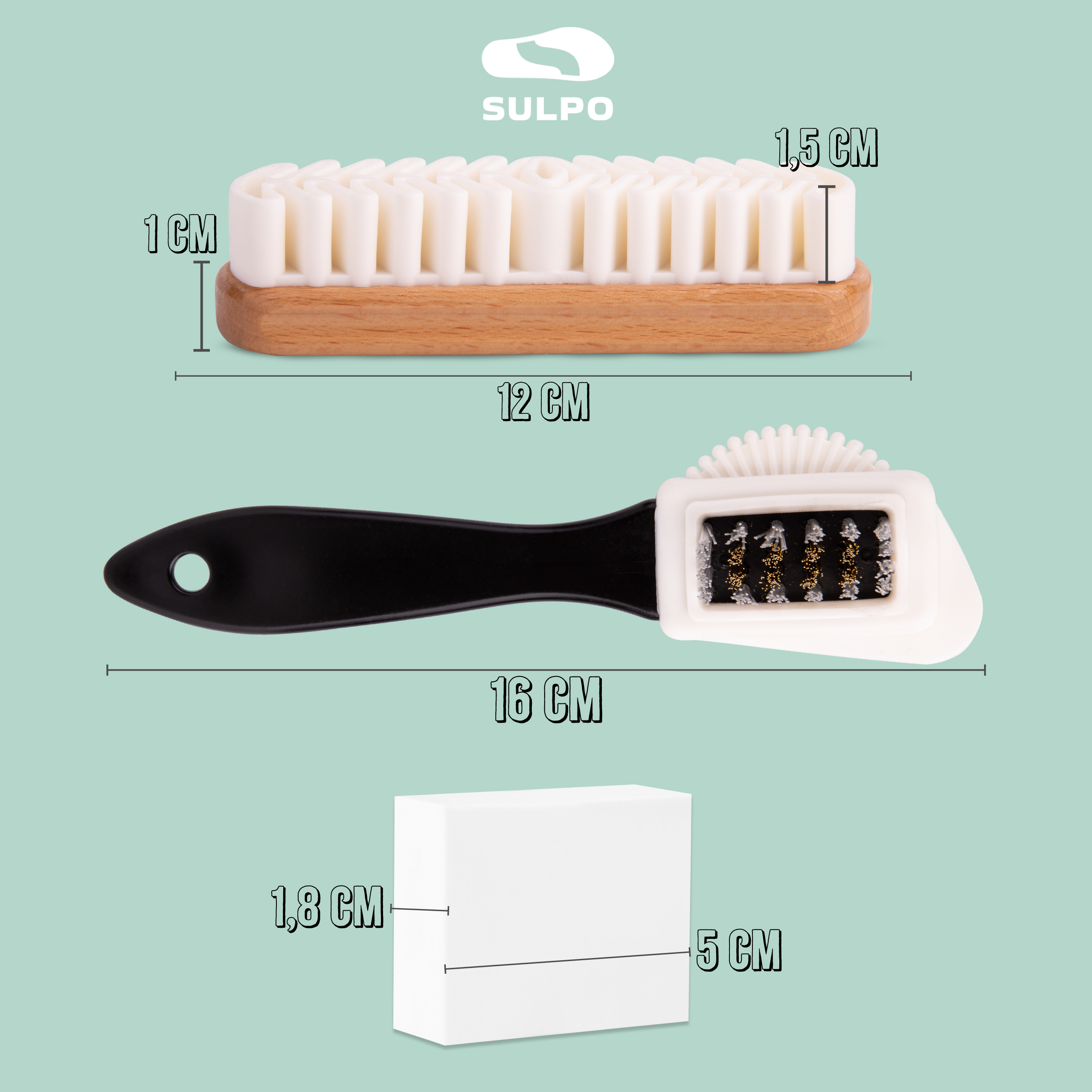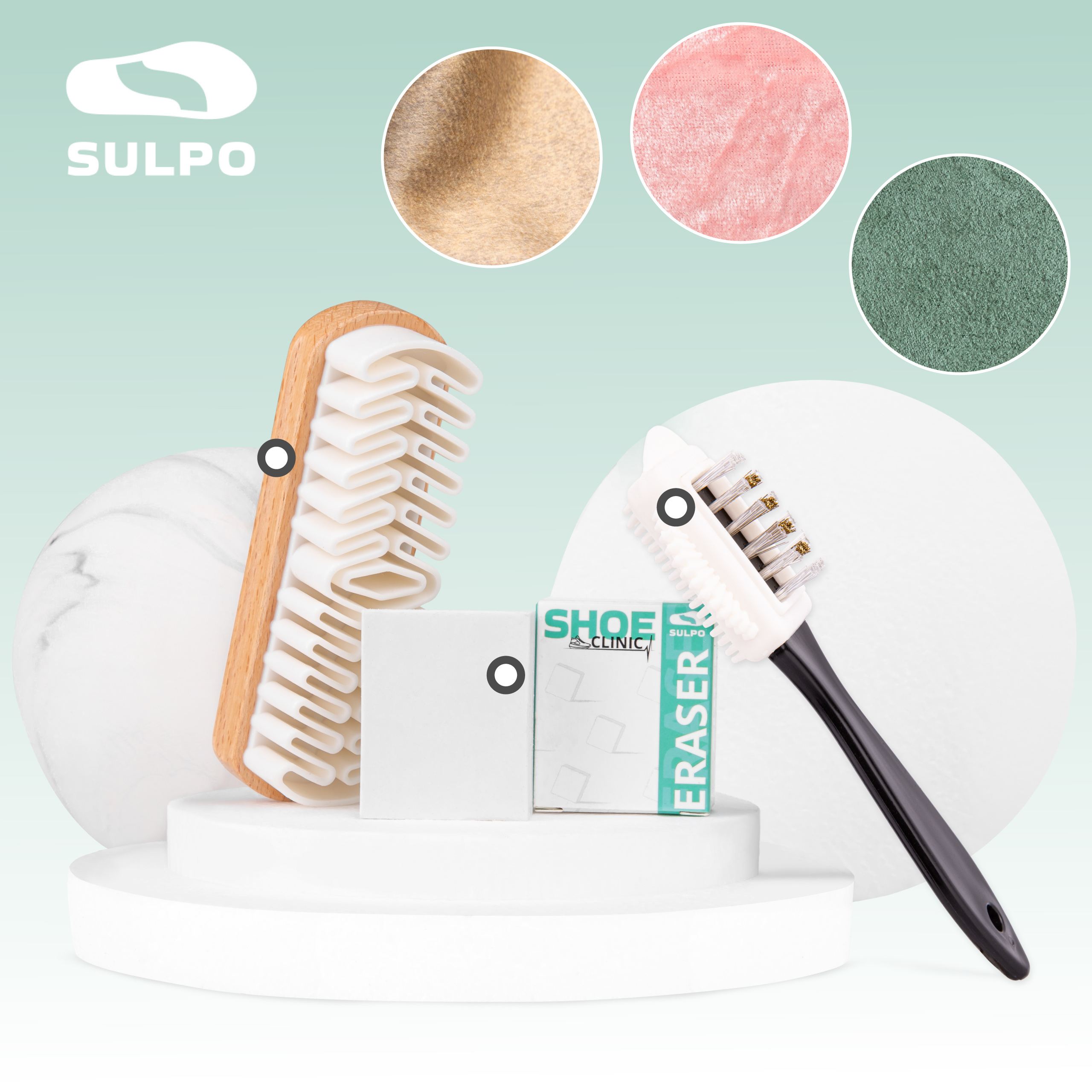 Kompletny zestaw SULPO do czyszczenia i odświeżania butów z delikatnych materiałów, takich jak zamsz, nubuk czy welur. Dzięki trzem uzupełniającym się akcesoriom, skutecznie usuniesz brud, kurz i zanieczyszczenia, nie niszcząc struktury materiału.
