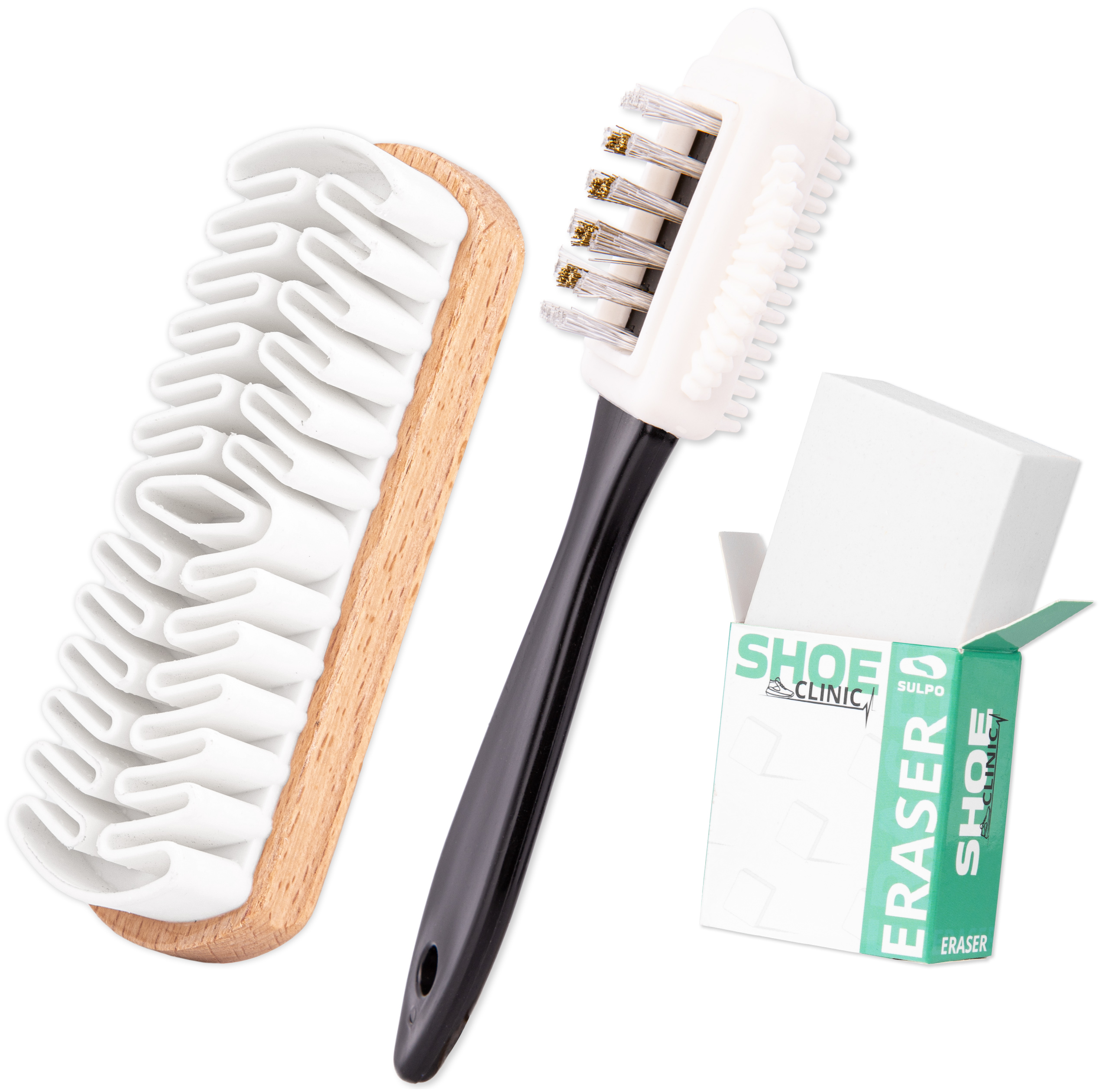 - Praktyczny komplet do pielęgnacji obuwia z zamszu, nubuku i weluru – zawiera dwie szczotki i gumkę, które skutecznie usuwają zabrudzenia, nie naruszając delikatnej struktury materiału.