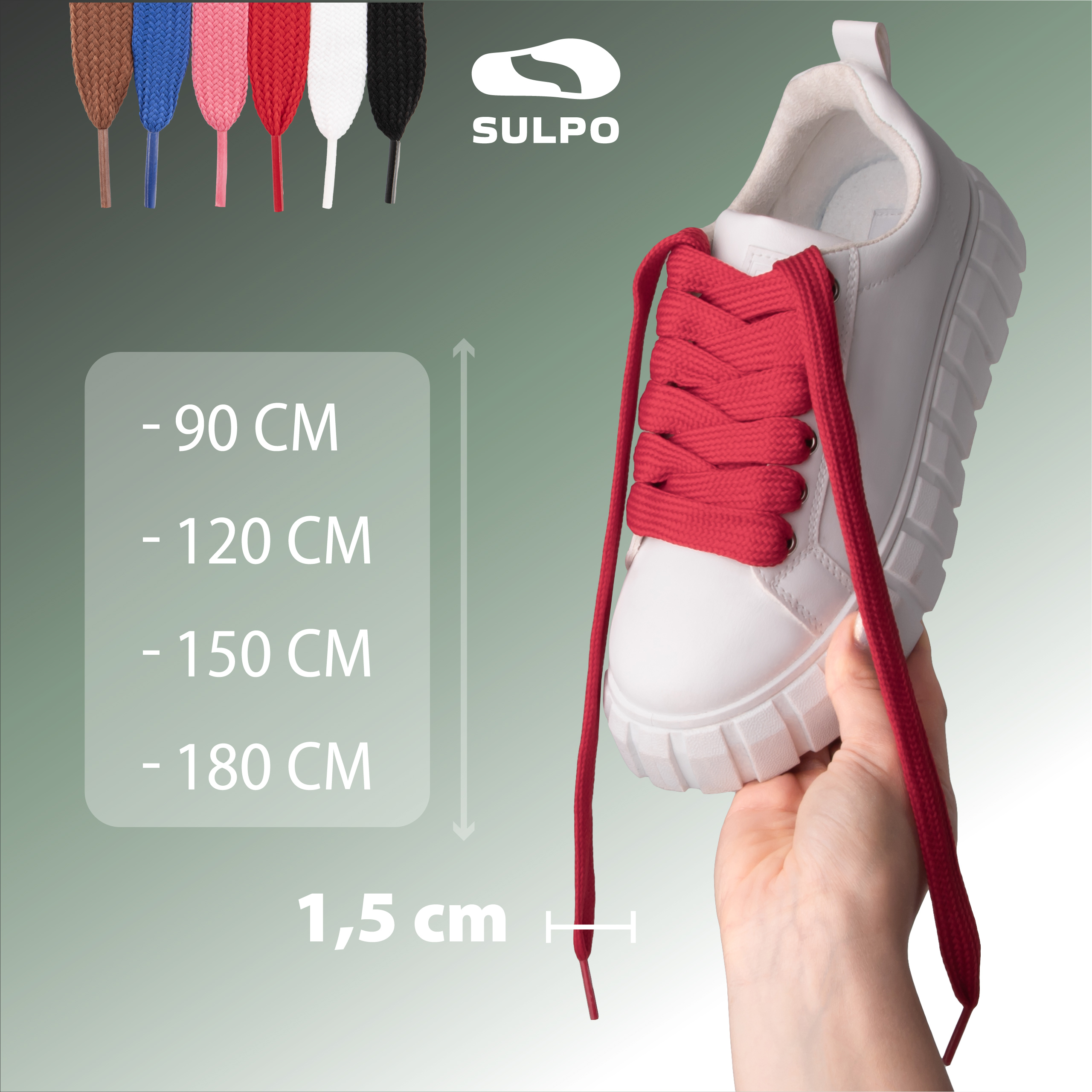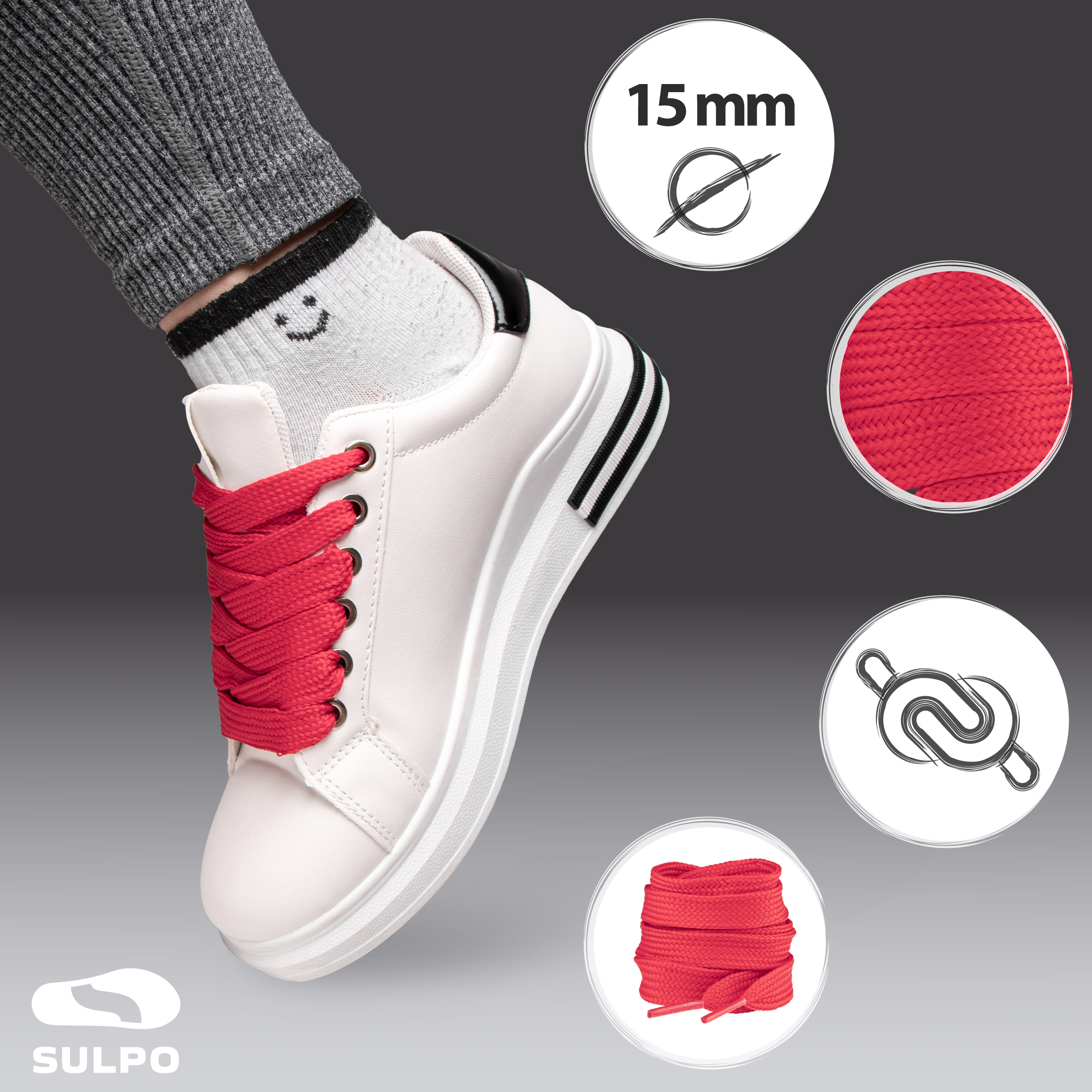 Sznurówki Sulpo o szerokości 15 mm to praktyczne i efektowne rozwiązanie dla osób ceniących wygodę, trwałość oraz modny wygląd obuwia. Doskonale sprawdzą się w butach sportowych, sneakersach, trampkach czy obuwiu codziennym – zarówno dziecięcym, młodzieżowym, jak i dla dorosłych.