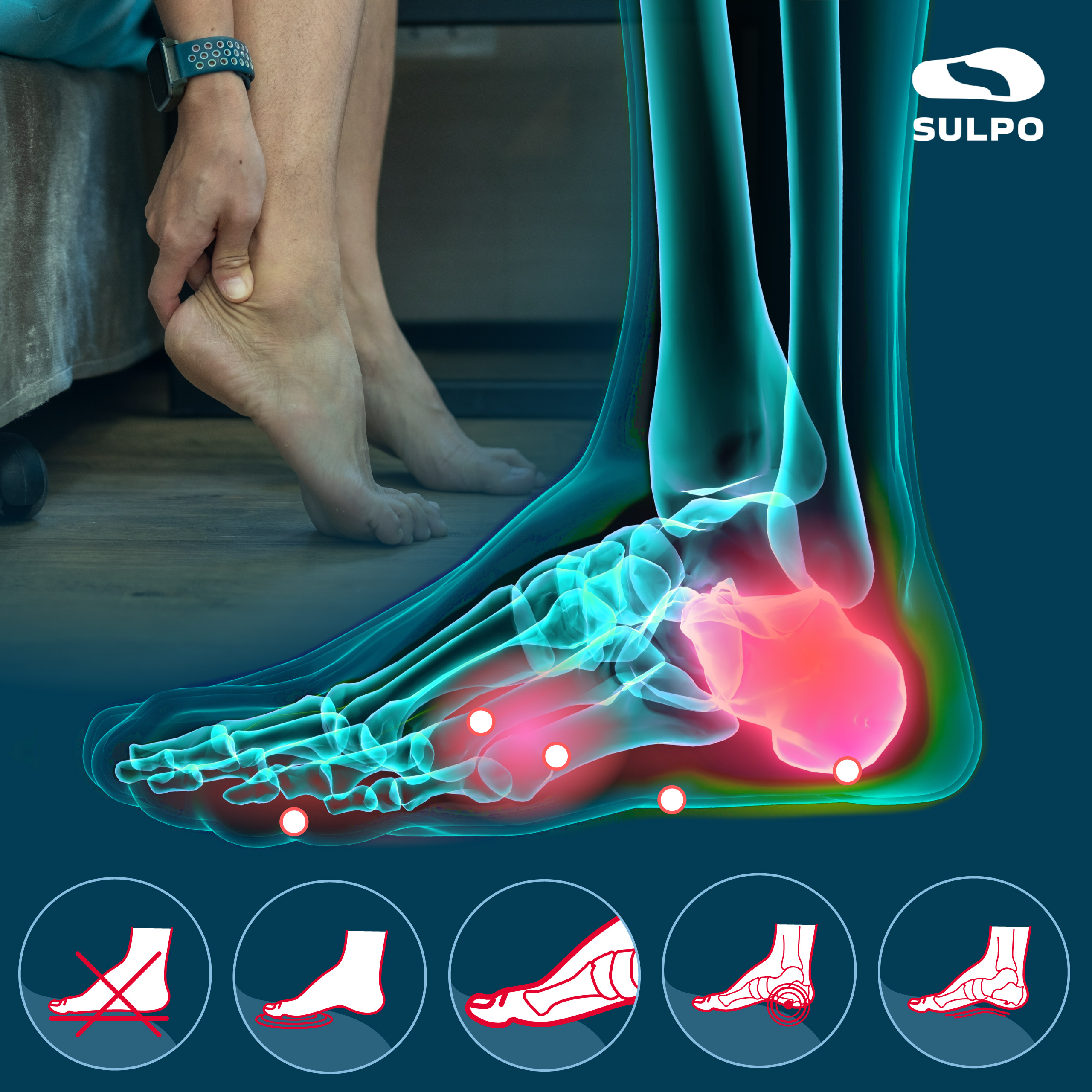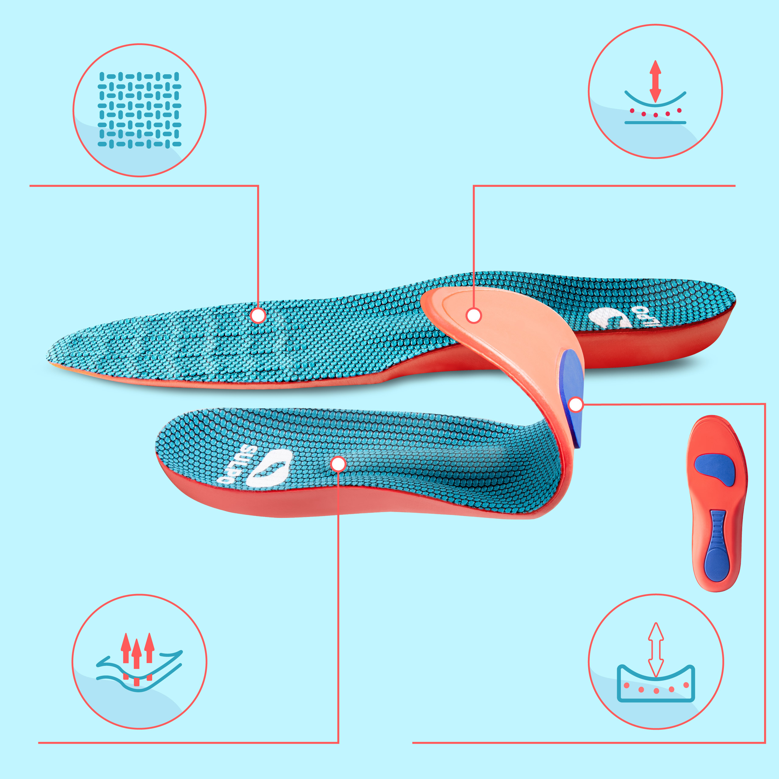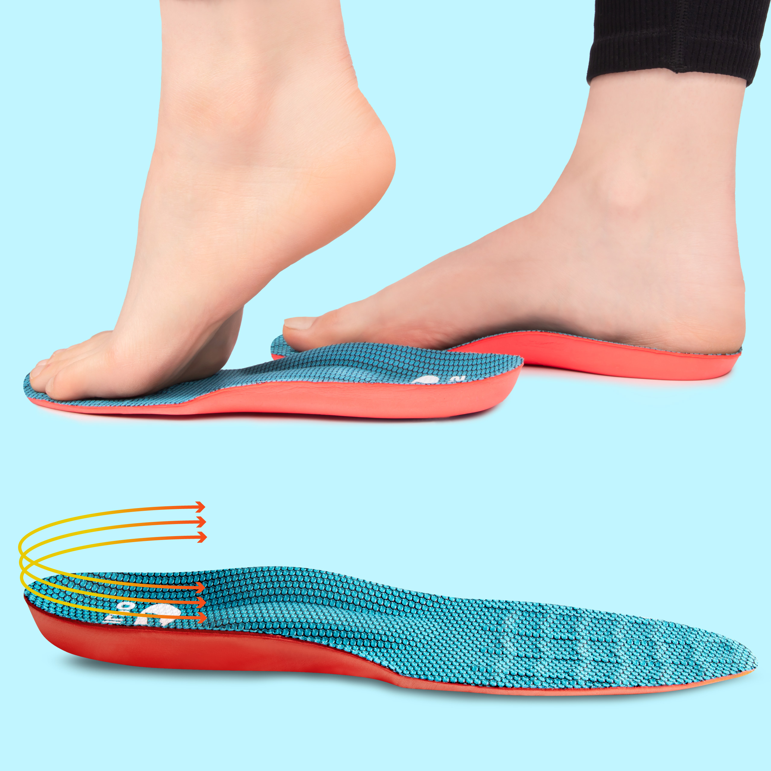 Wkładki zostały zaprojektowane z myślą o osobach zmagających się z płaskostopiem, ostrogą piętową oraz przeciążeniami śródstopia. Specjalna konstrukcja wspiera łuk stopy oraz minimalizuje nacisk na powięź podeszwową.