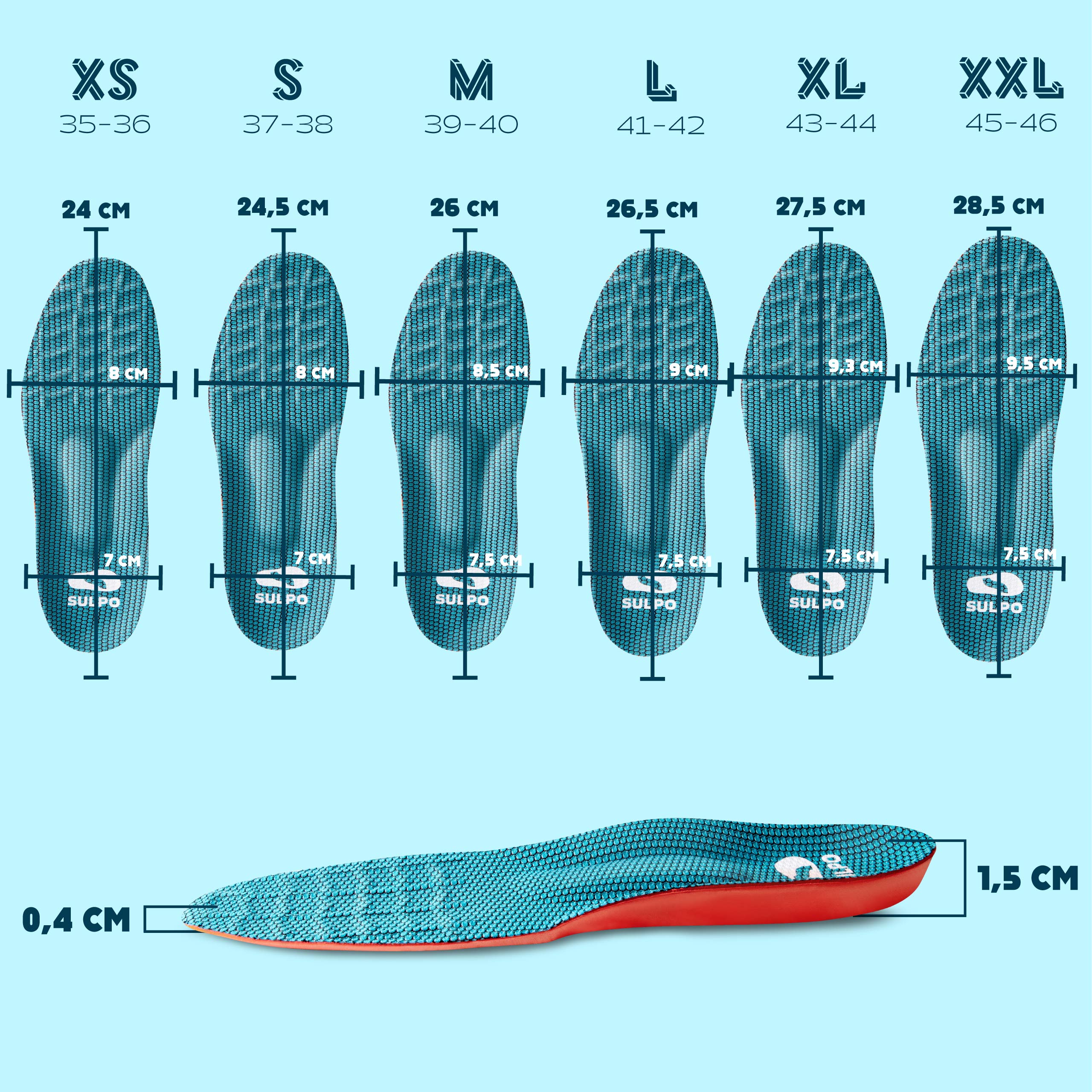 • Ortopedyczne wkładki SULPO z pianki EVA – amortyzujące, wspierające łuk stopy, idealne na płaskostopie i ostrogę piętową.