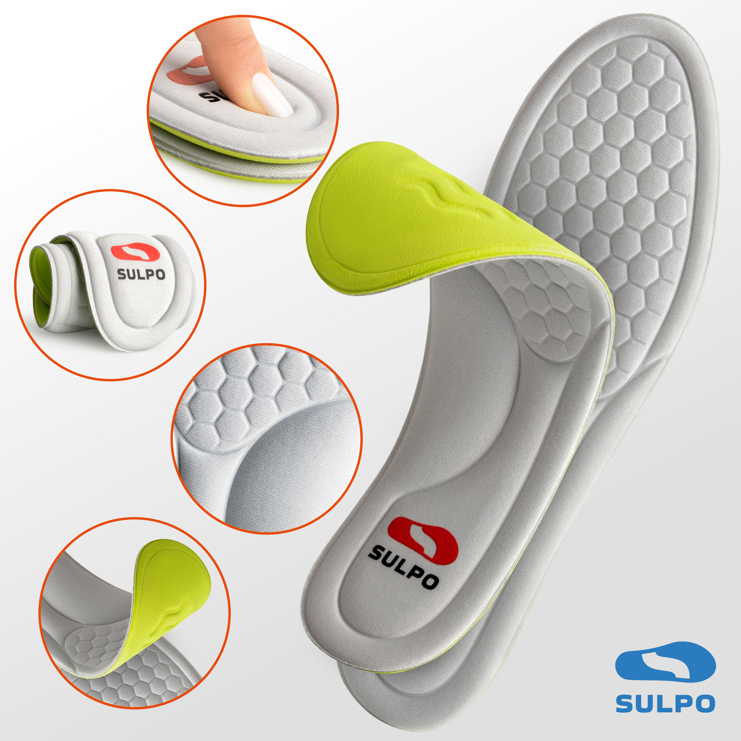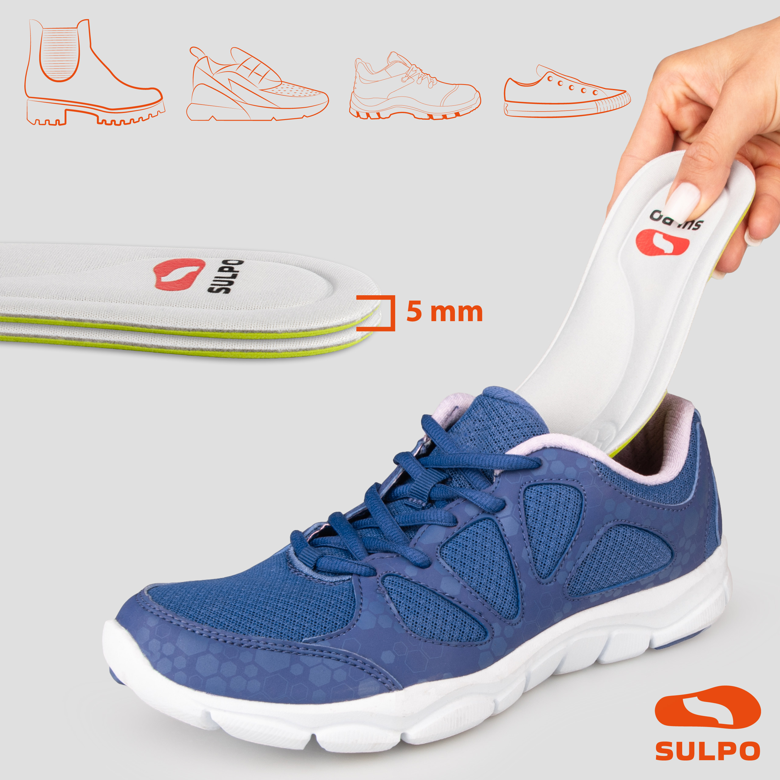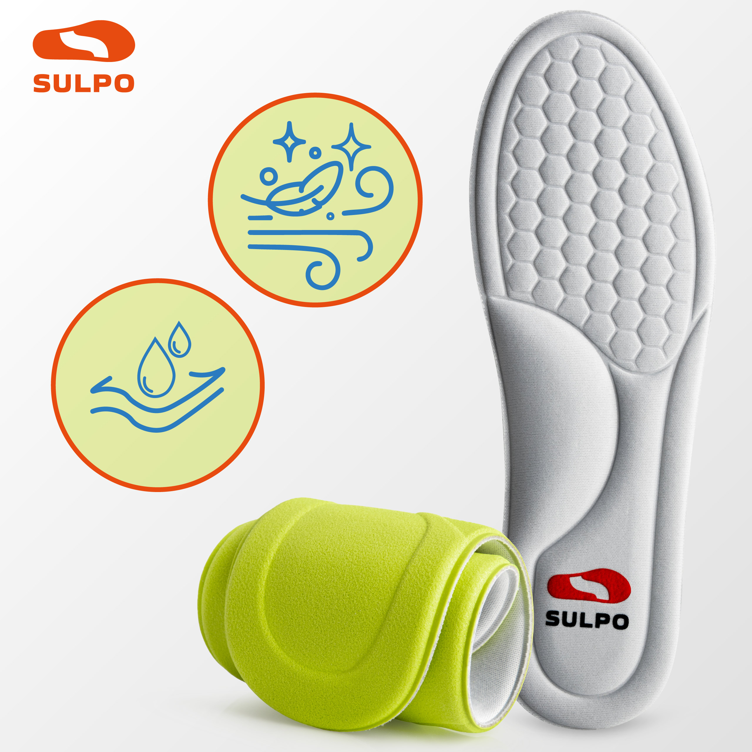 Wkładki SULPO są niezwykle lekkie, dzięki czemu nie obciążają stopy i pozostają niemal niewyczuwalne podczas chodzenia. Wykonane z oddychających materiałów umożliwiają swobodną cyrkulację powietrza, skutecznie redukując wilgoć i ograniczając pocenie się stóp.