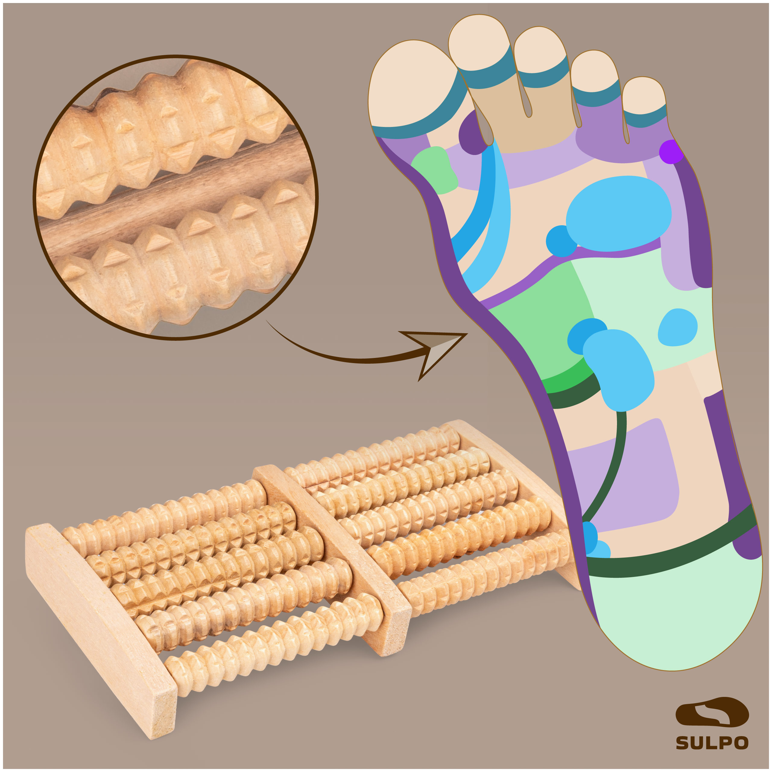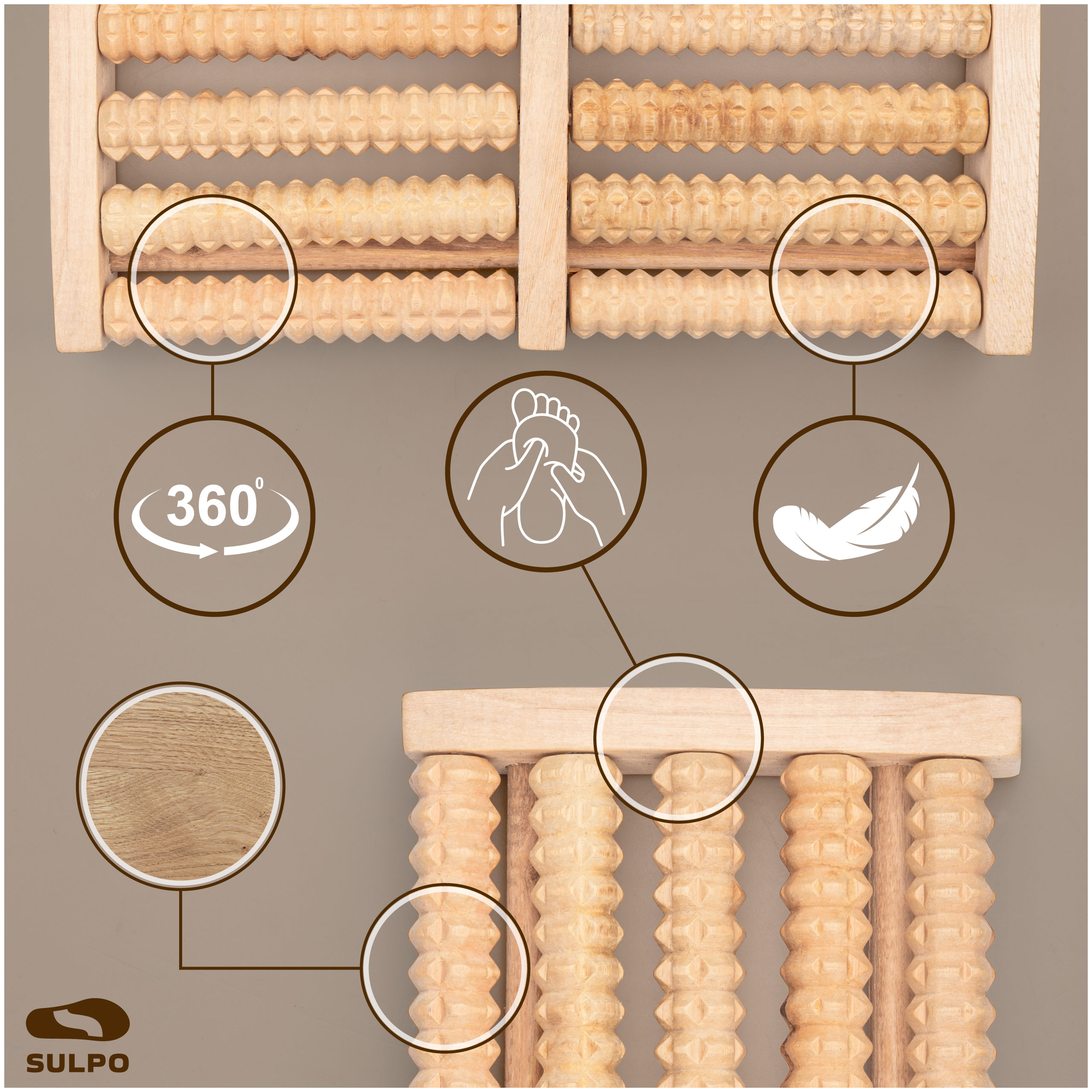 Specjalnie zaprojektowane rolki obracają się o 360°, umożliwiając skuteczny masaż całej powierzchni stóp bez zbędnego wysiłku. Ich specjalnie wyprofilowane wypustki stymulują punkty akupresury, wspierając zdrowie i relaks. Dzięki ergonomicznej budowie masażer zapewnia komfortowe użytkowanie zarówno w domu, jak i w biurze. Naturalne drewno jest delikatne dla skóry, a jednocześnie trwałe i odporne na codzienne użytkowanie.