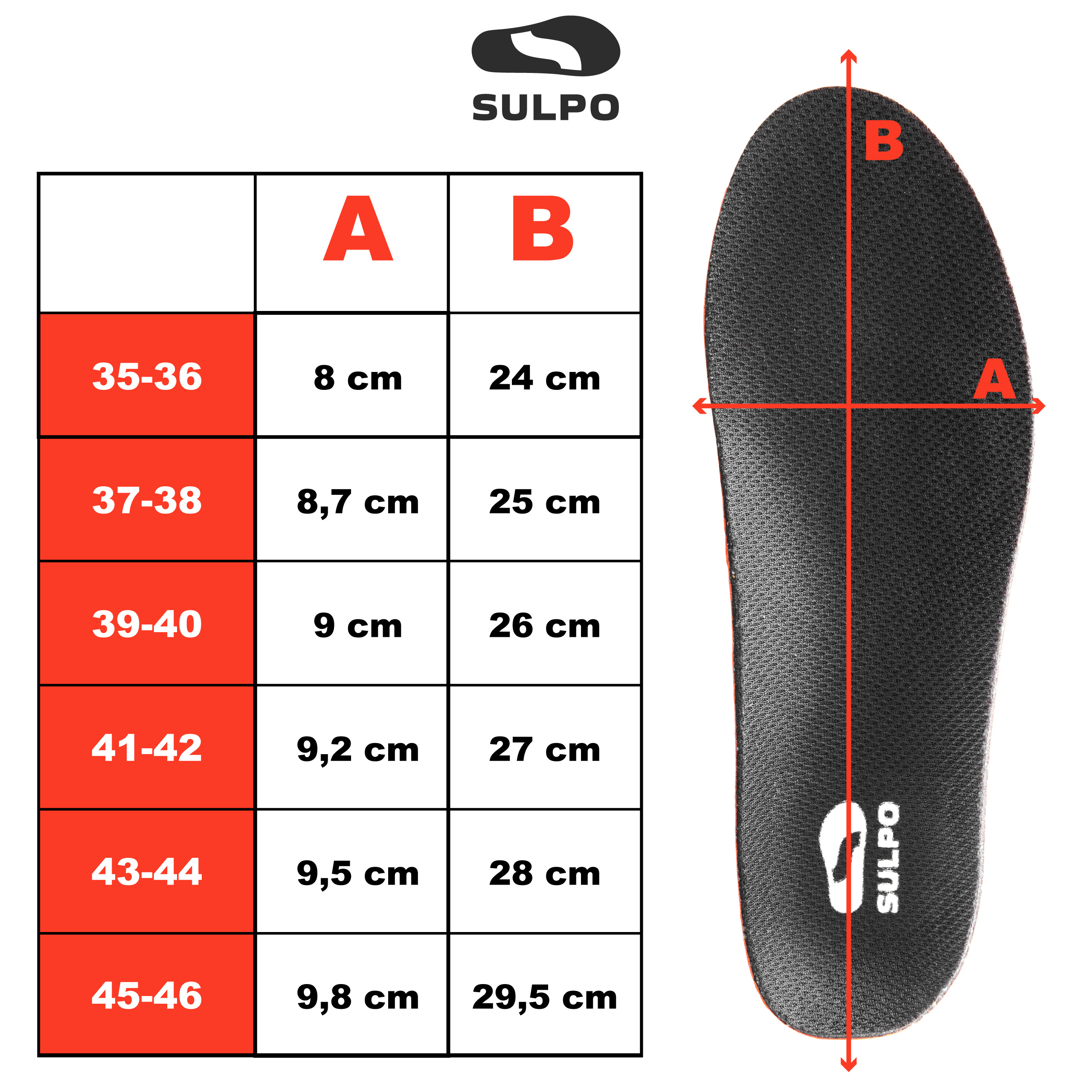 Wkładki można łatwo przyciąć. Dzięki temu idealnie wpasowują się w każde obuwie i nie powodują dyskomfortu. Dostępne są warianty od rozmiaru 35 do 46. Szczegółowa tabela z wymiarami (szerokość A i długość B) ułatwia dobór odpowiedniego modelu.