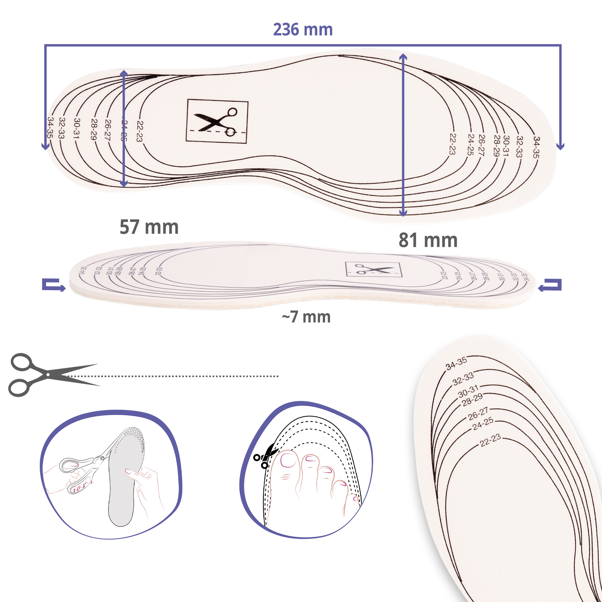 Długość całkowita wkładki to 23,6 cm, można ją docinać według zaznaczonych linii pomocniczych.