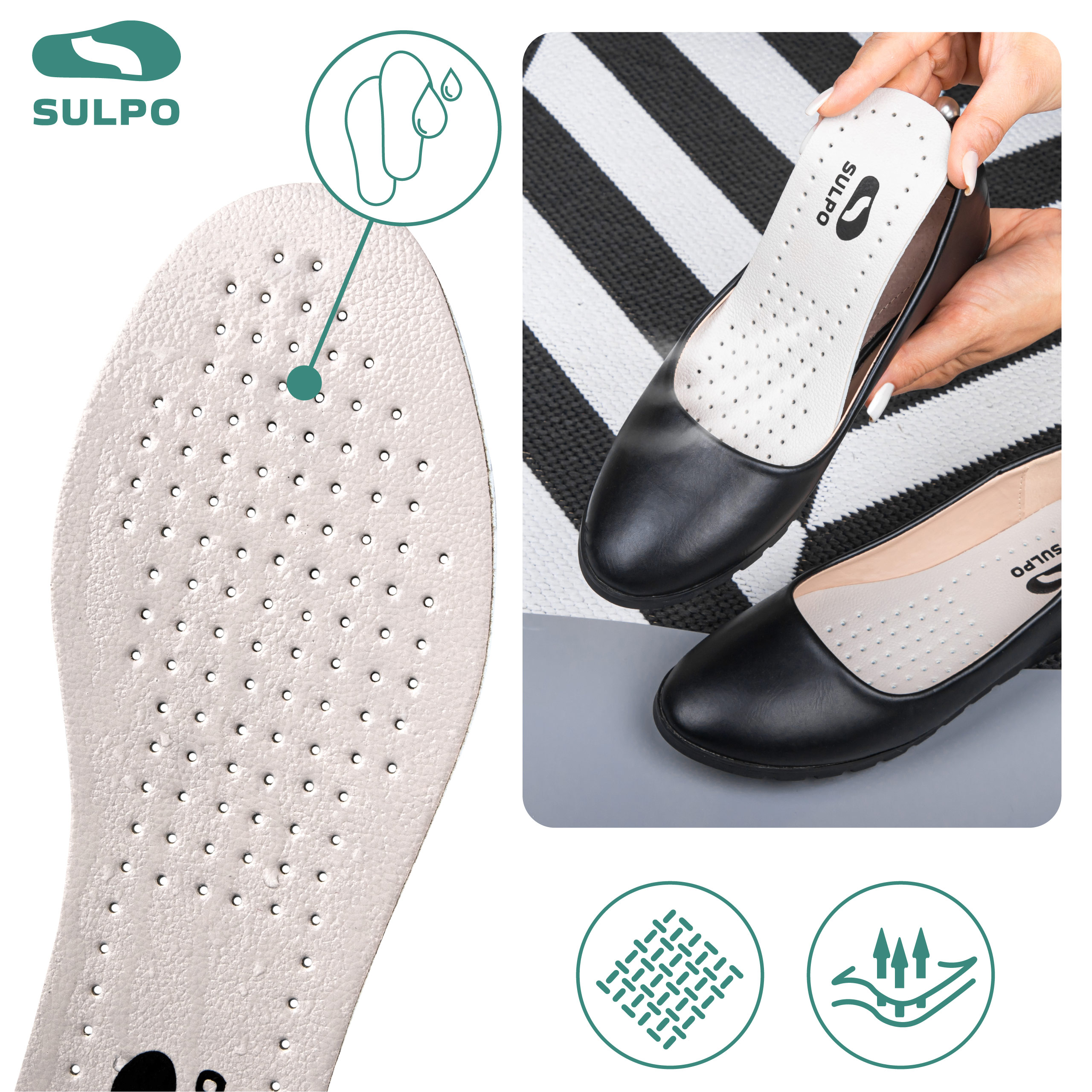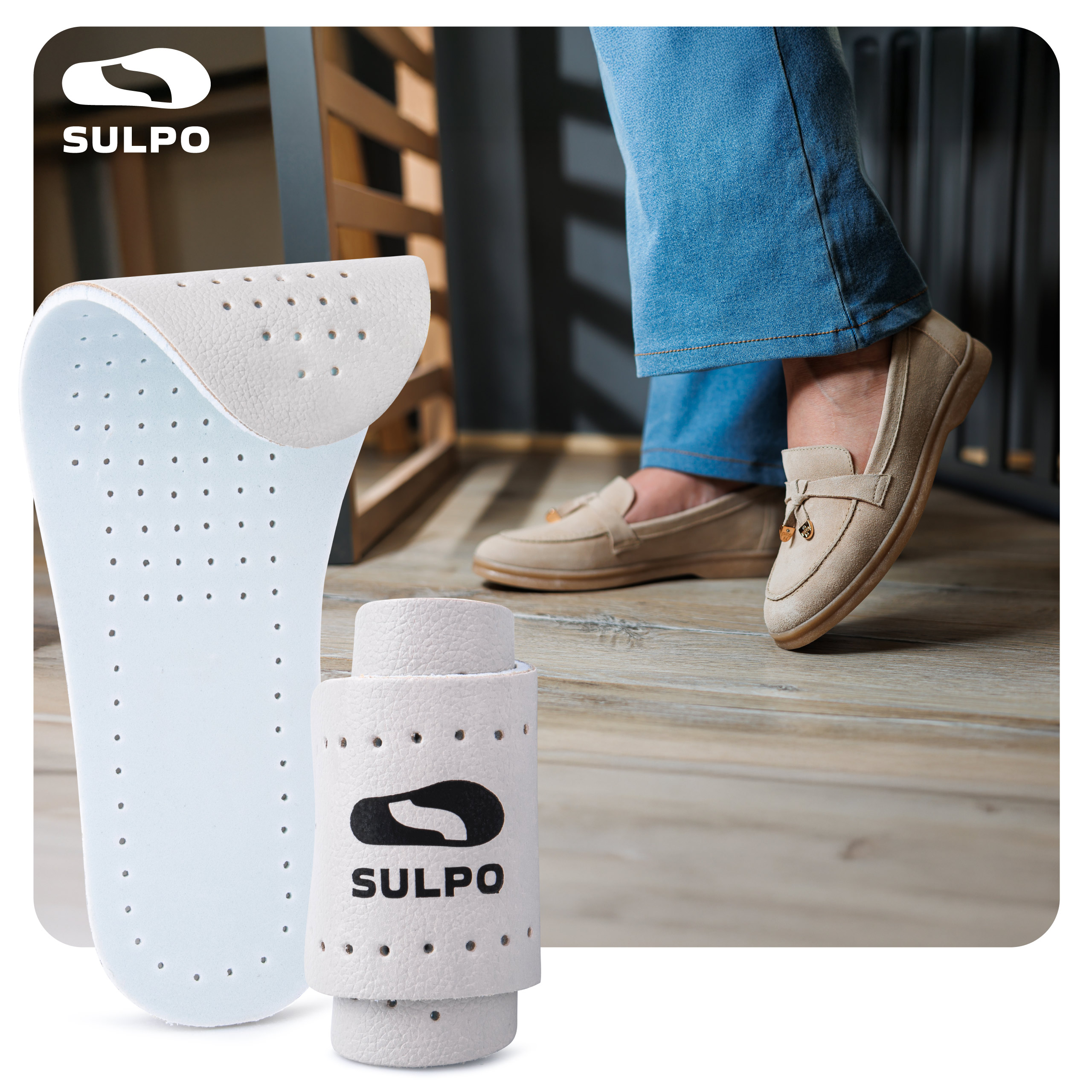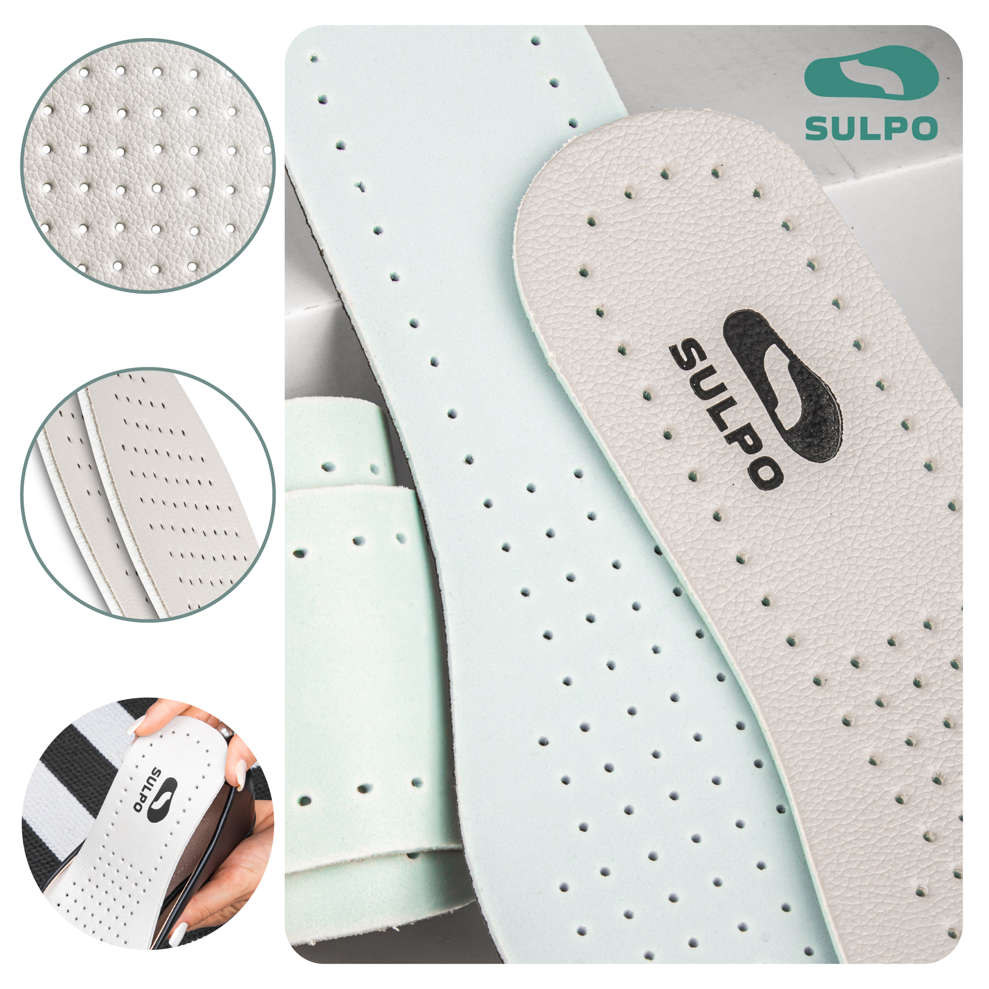 • Skórzane wkładki SULPO – cienkie, elastyczne wkładki z naturalnej skóry i lateksu, zapewniające amortyzację, wentylację i wygodę w każdym rodzaju obuwia.