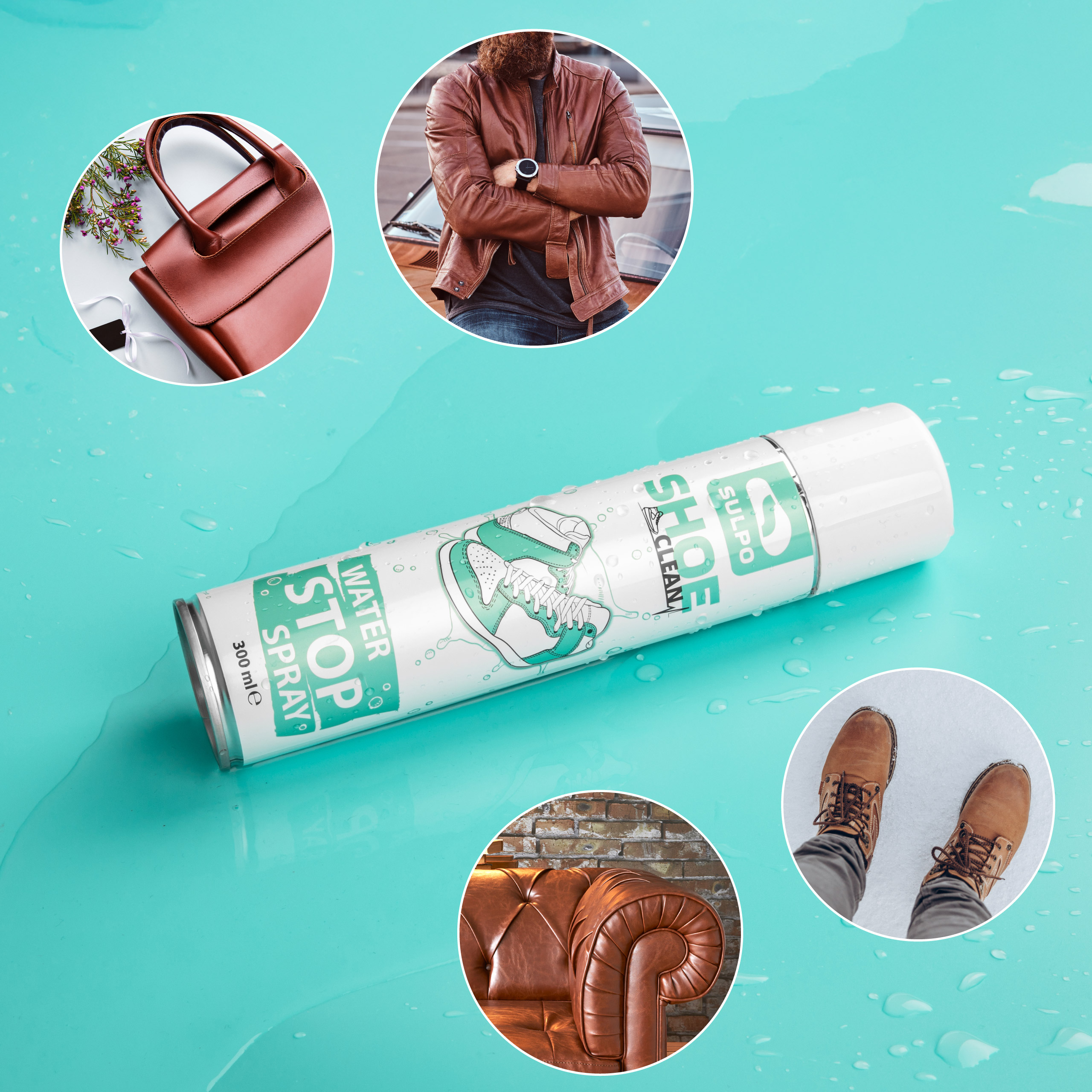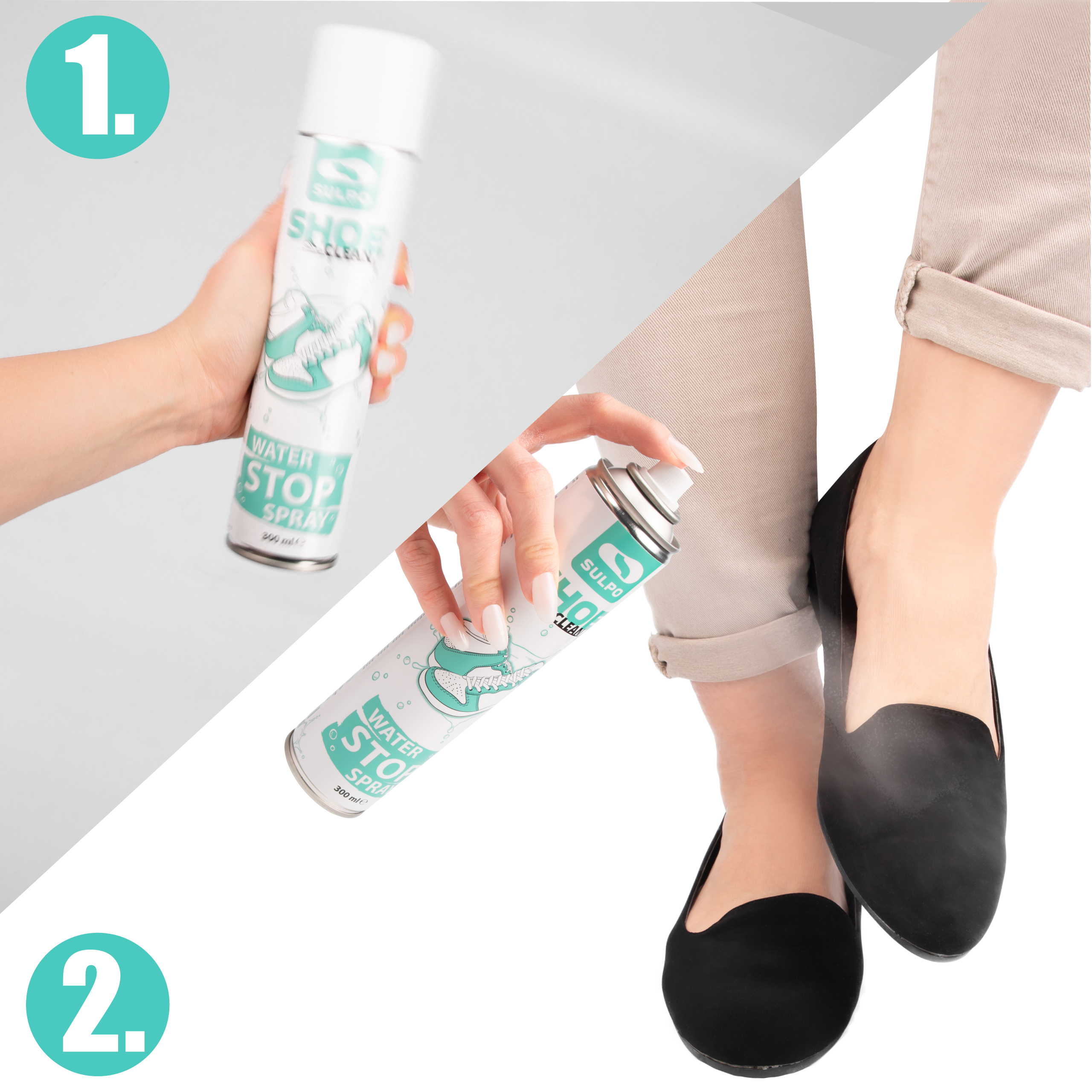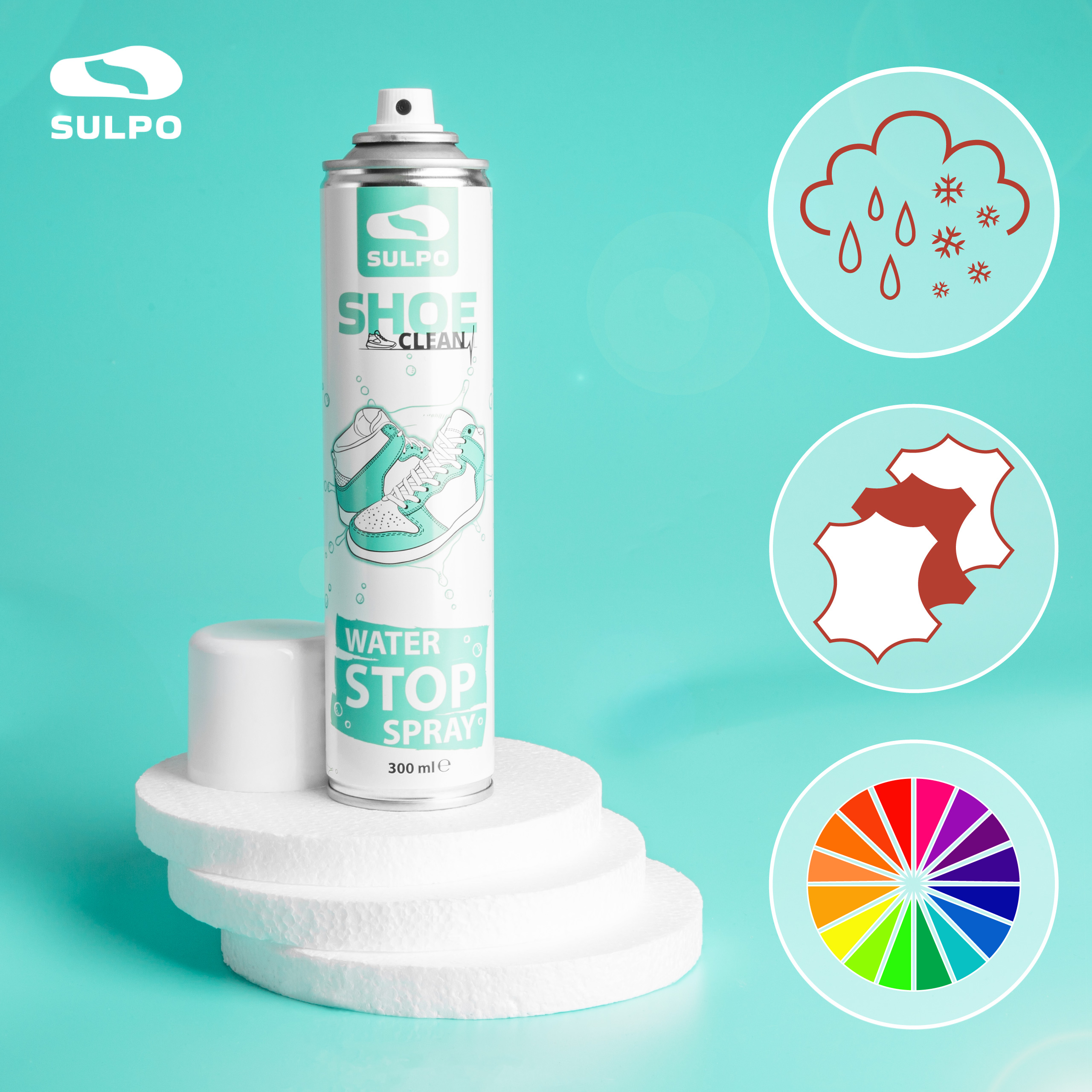- Impregnat SULPO Water Stop – uniwersalny spray ochronny, który tworzy niewidoczną, wodoodporną powłokę zabezpieczającą obuwie i tekstylia przed wilgocią, zabrudzeniami i solą. Idealny do wszystkich materiałów i kolorów.