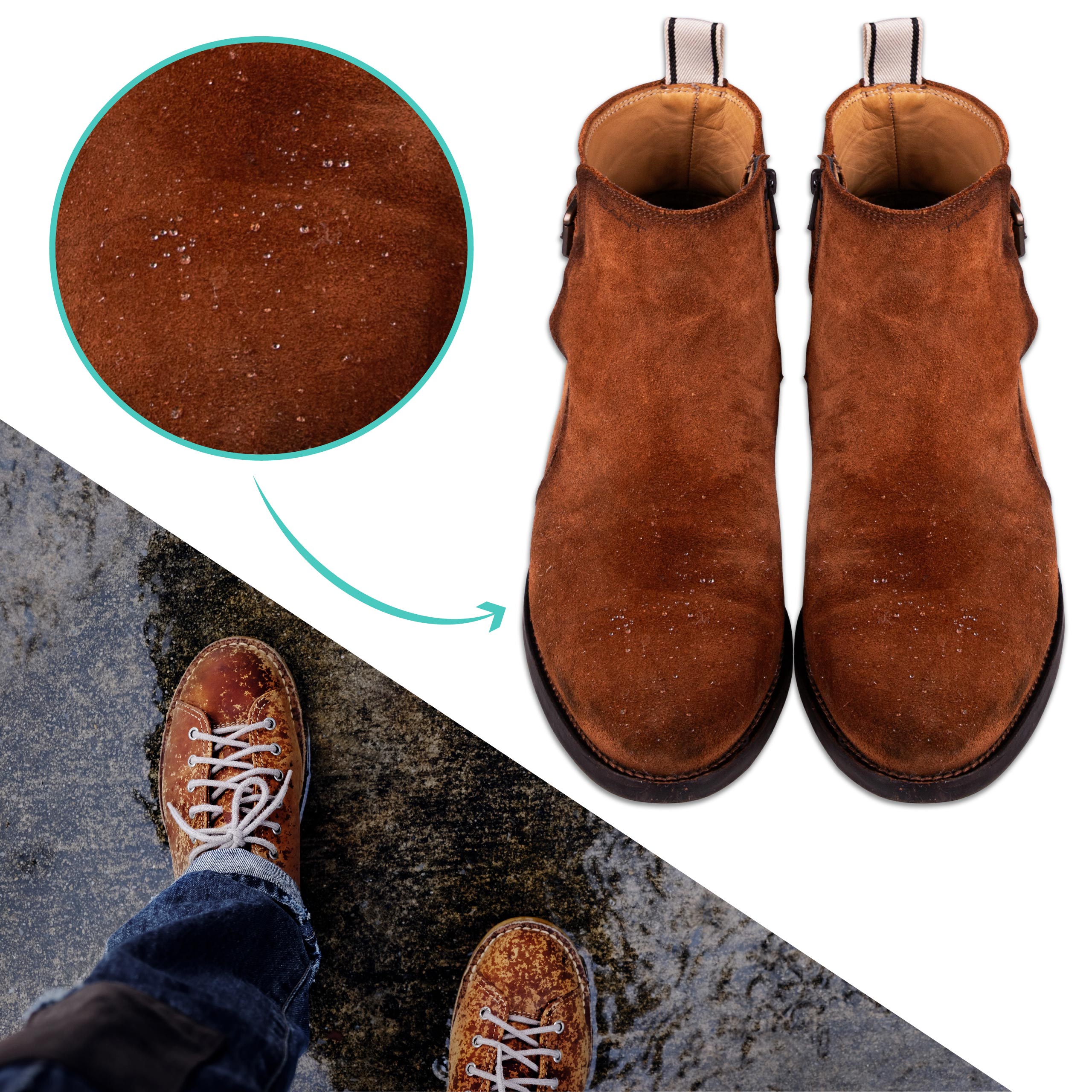 Innowacyjna formuła zapobiegająca przenikaniu wilgoci i wody do skóry oraz wyrobów tekstylnych, takich jak buty, ubrania, torby, kurtki itp. Odpowiednia do wszystkich kolorów produktów. Tworzy niewidoczną, wodoszczelną i ochronną powłokę, co czyni go doskonałym wyborem w deszczowe dni. Nie zmienia koloru impregnowanej powierzchni.