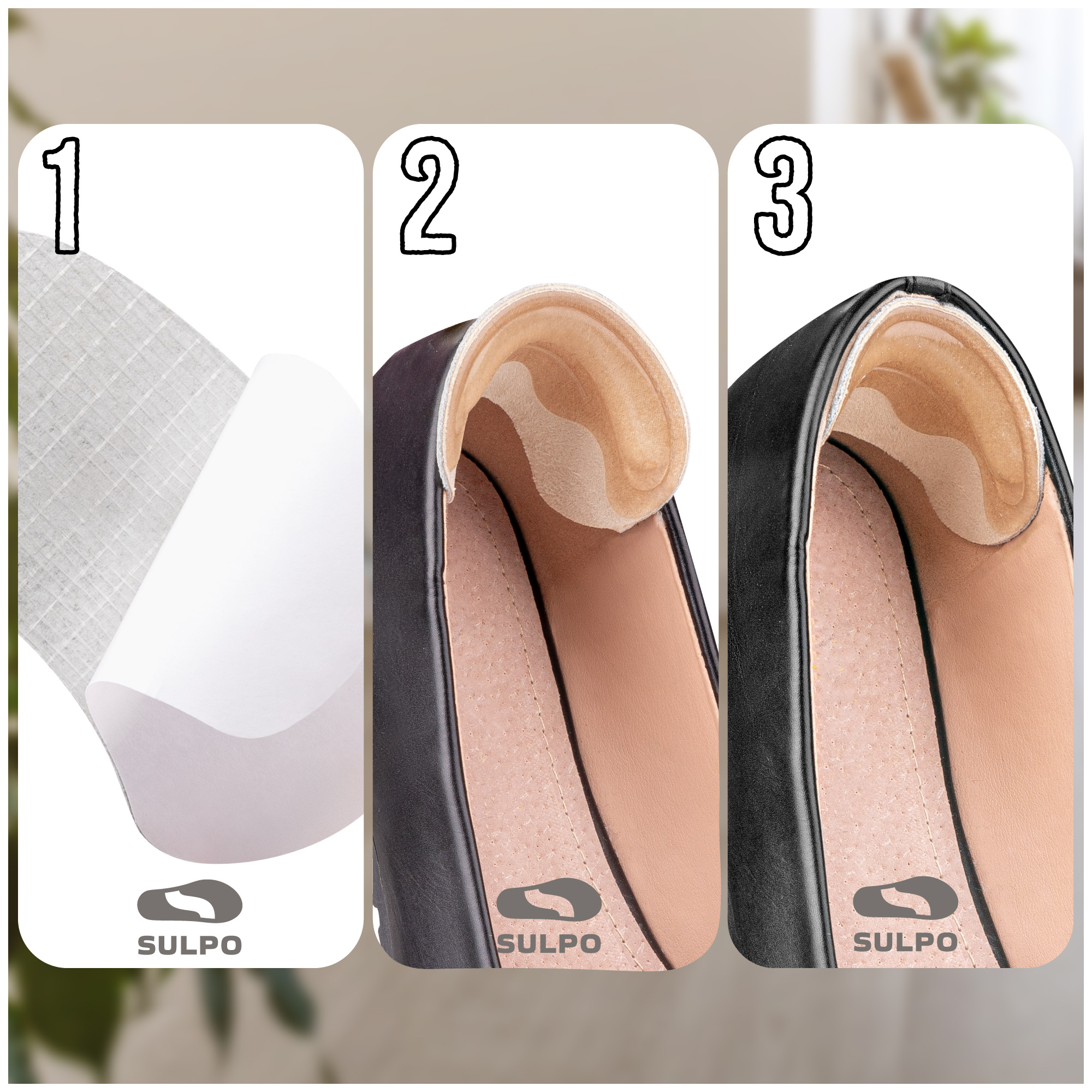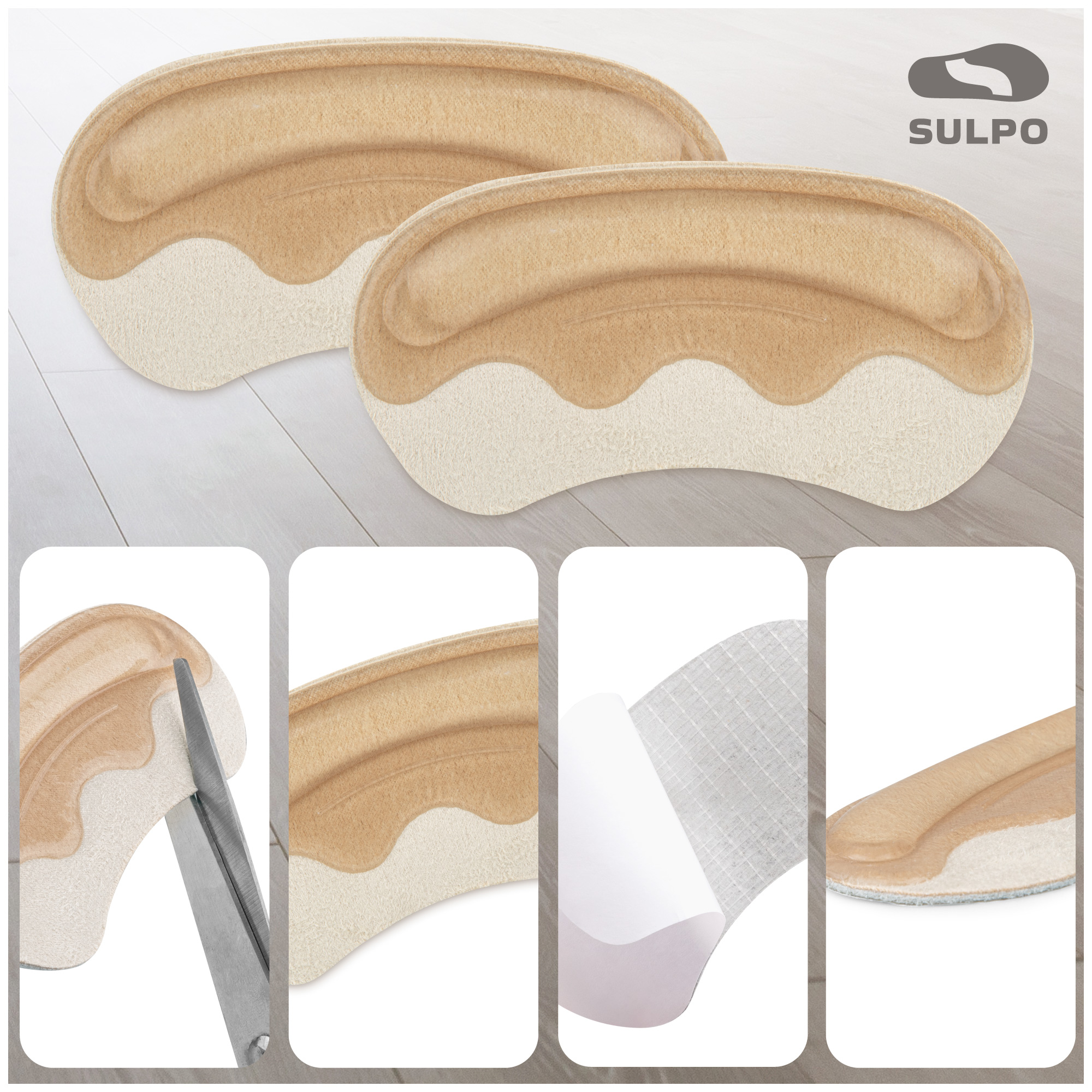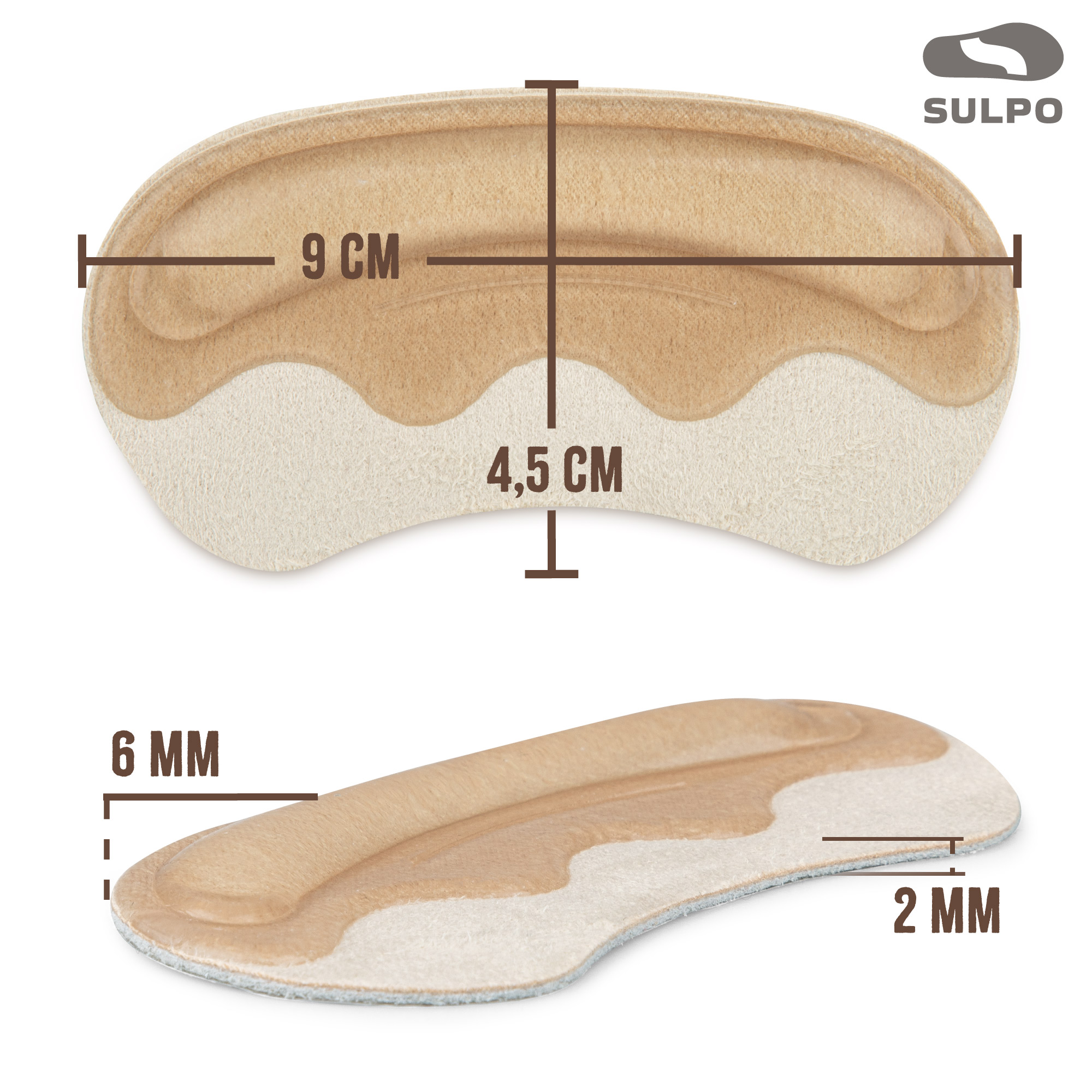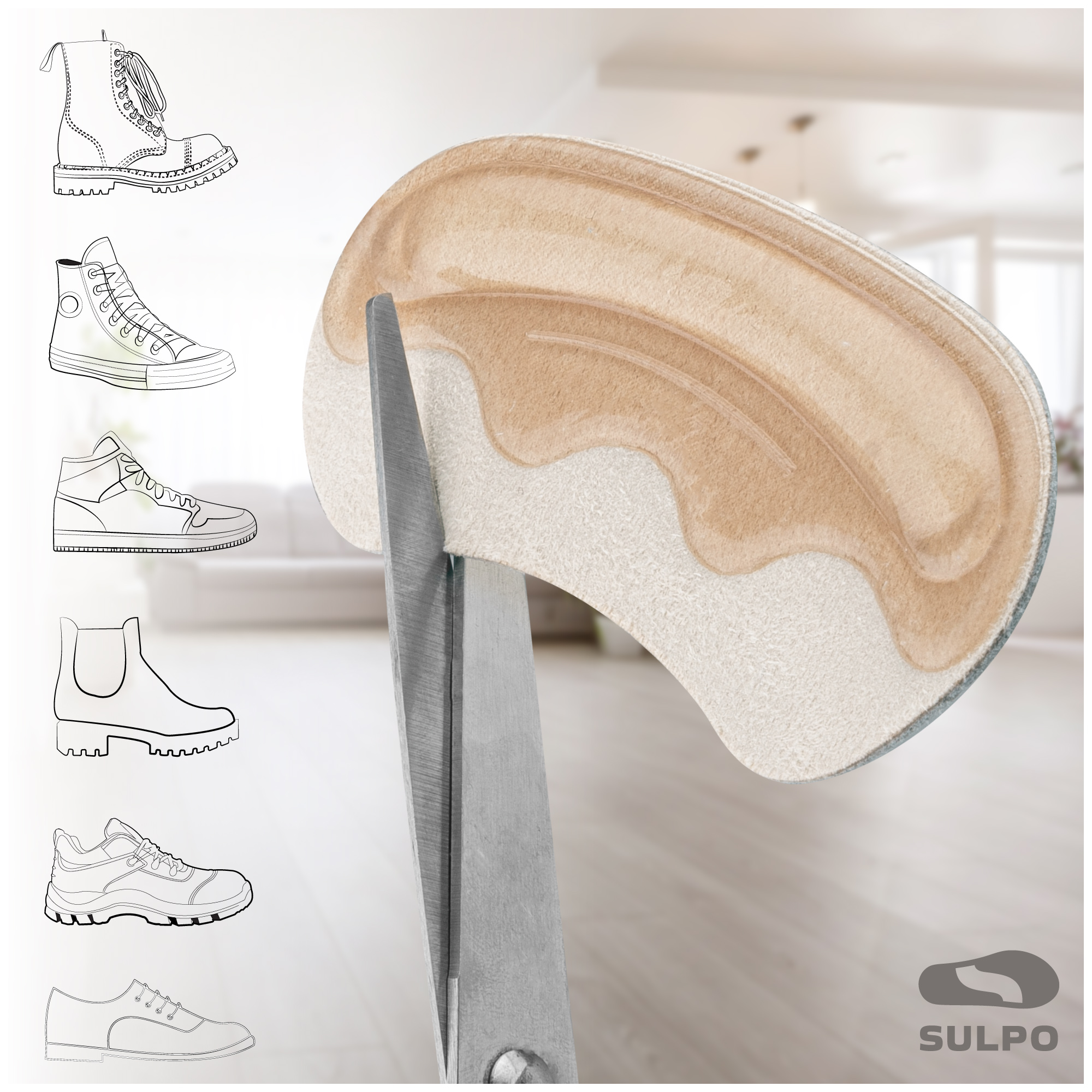 - Zapiętki żelowe SULPO – miękkie, samoprzylepne wkładki z welurową tkaniną i żelową poduszką, które amortyzują piętę, zapobiegają otarciom i poprawiają dopasowanie obuwia w każdym rodzaju butów.