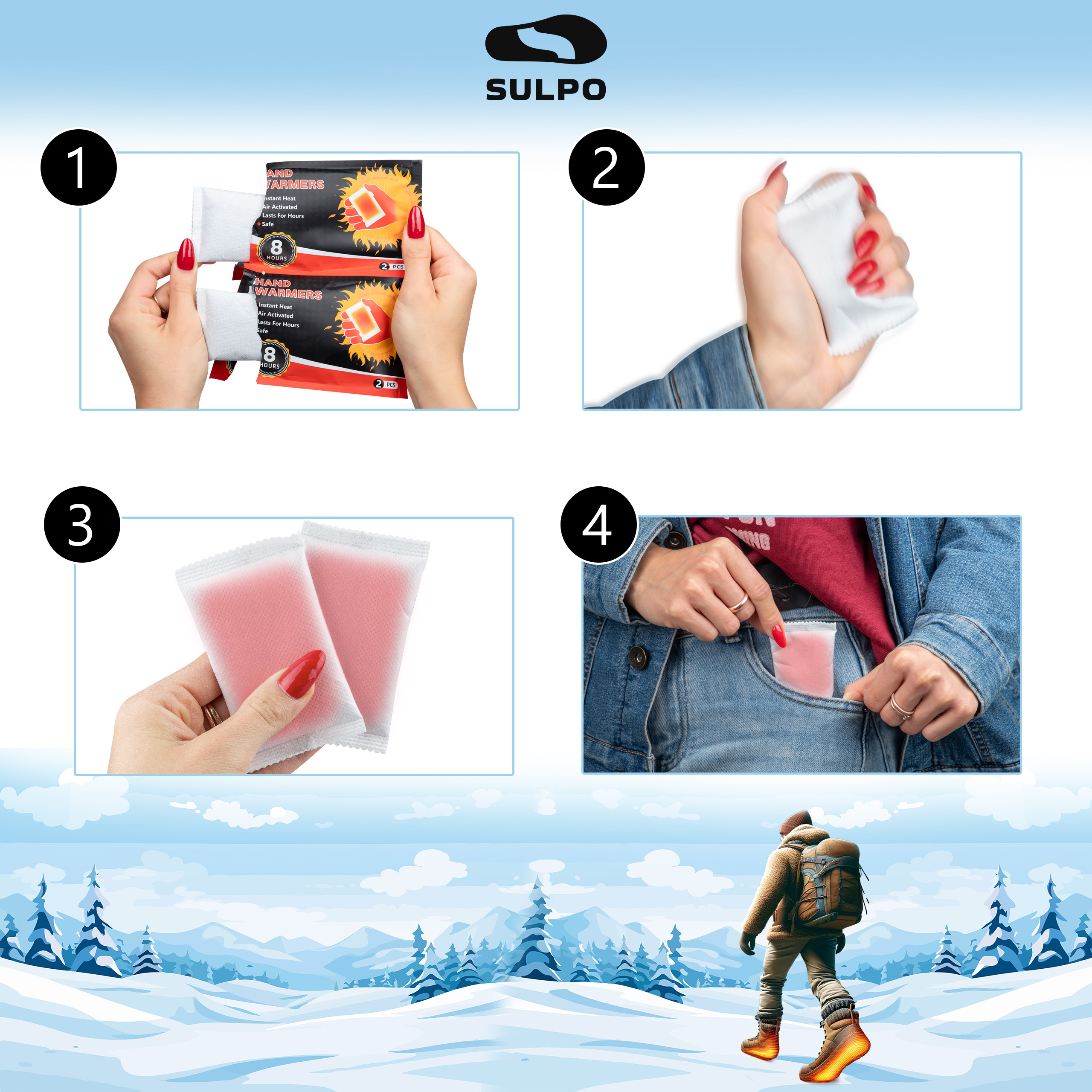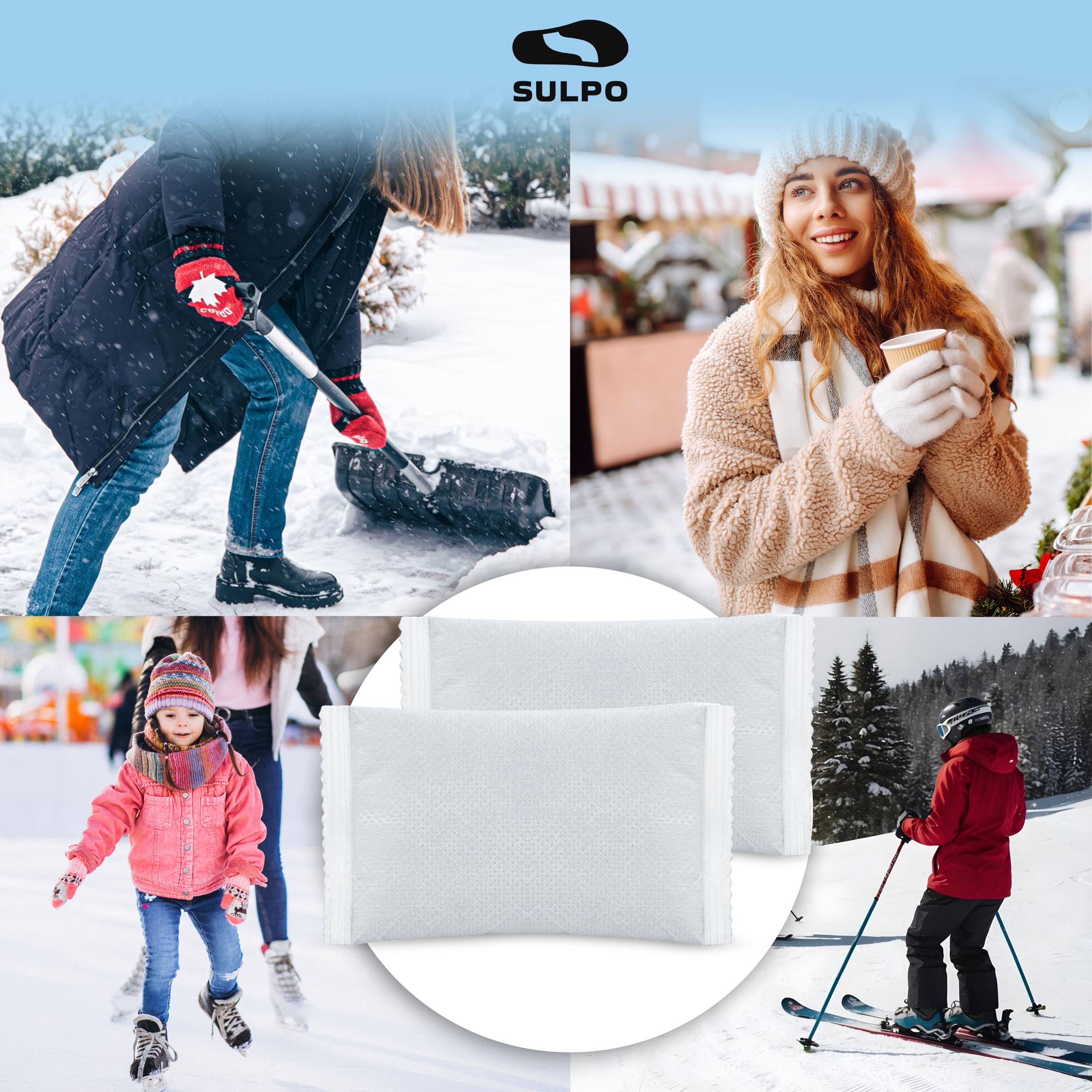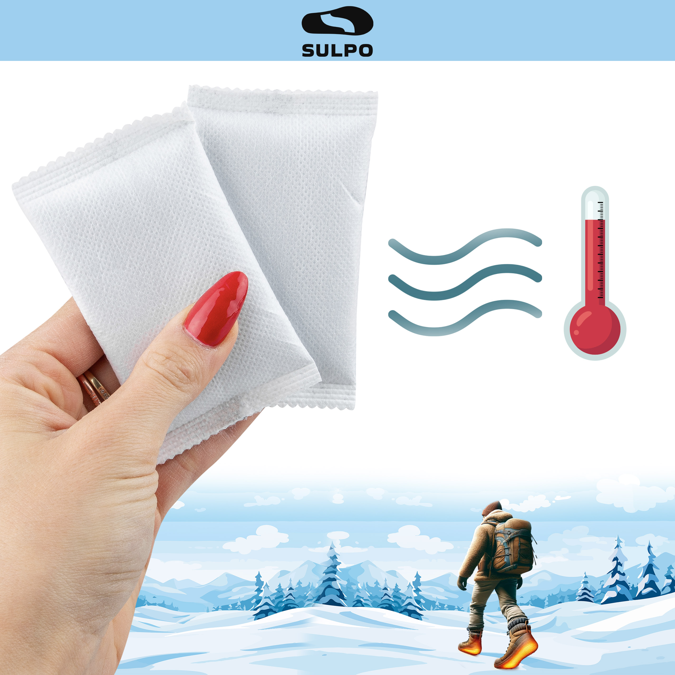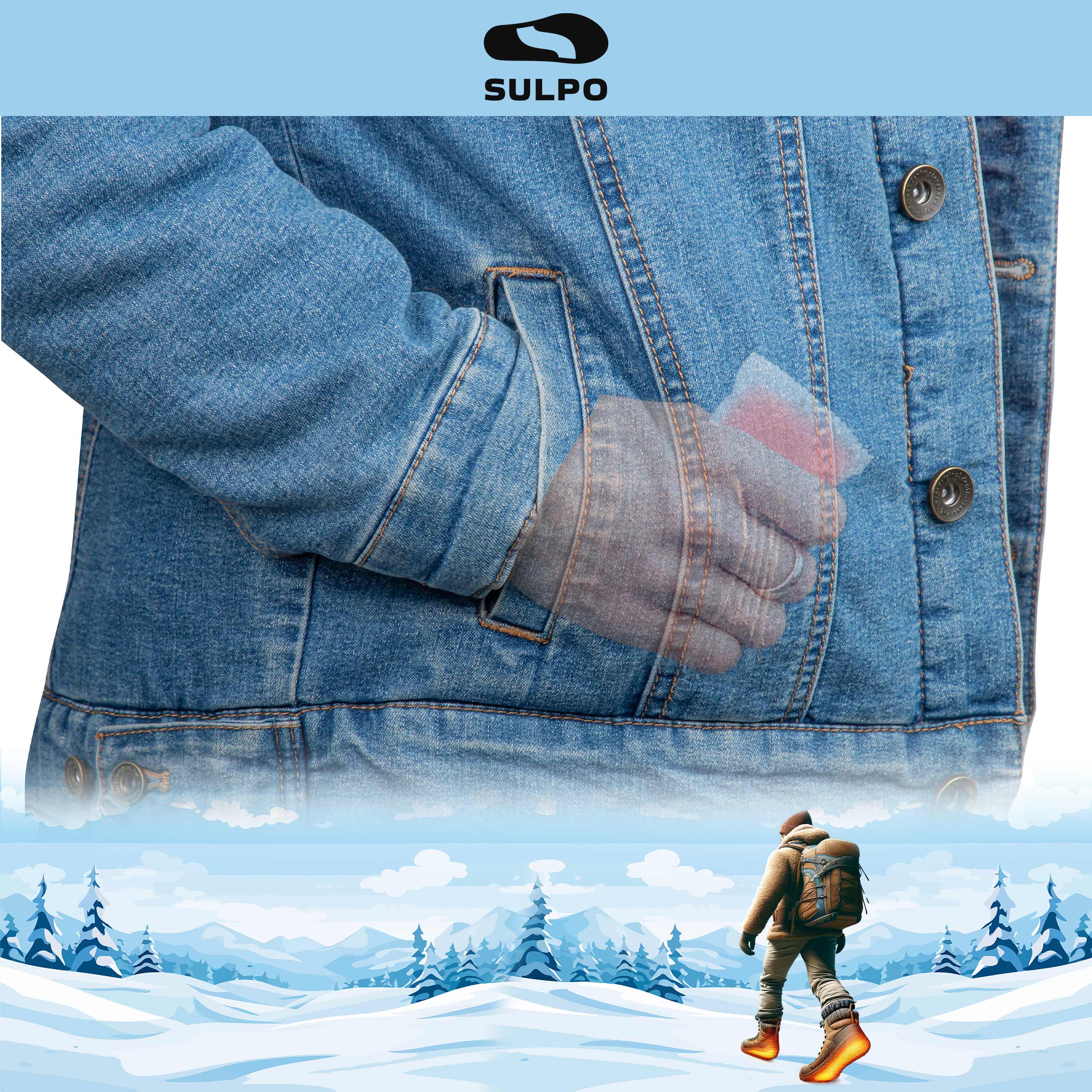 - Jednorazowe ogrzewacze do rąk SULPO – kompaktowe, bezpieczne wkłady grzewcze aktywowane powietrzem, które zapewniają do 8 godzin ciepła w kieszeni lub rękawiczkach.
