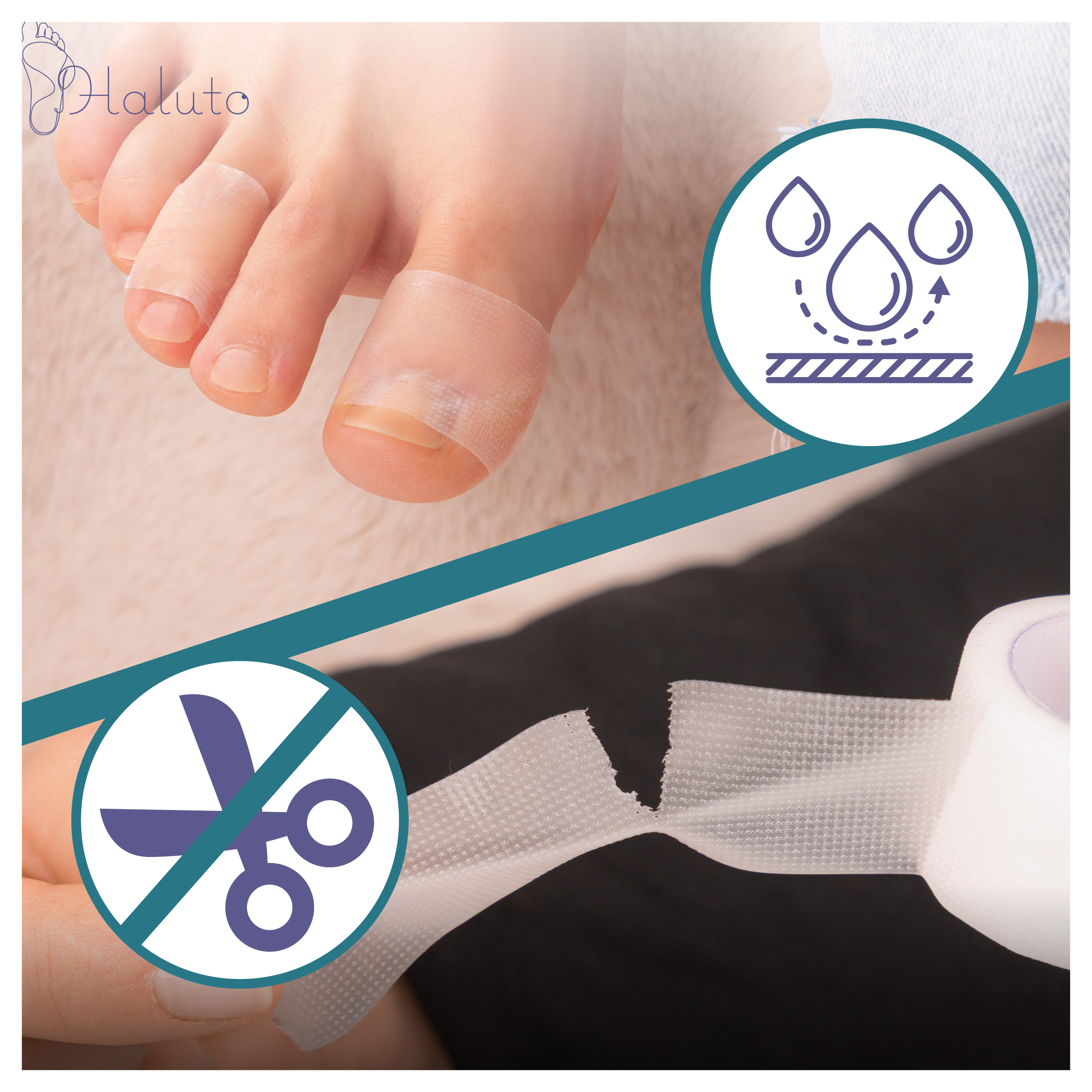 Taśma Haluto jest hipoalergiczna, nie powoduje podrażnień i nie zawiera lateksu. Nadaje się do skóry wrażliwej, także przy długim noszeniu obuwia. Komfortowa i neutralna dla ciała.