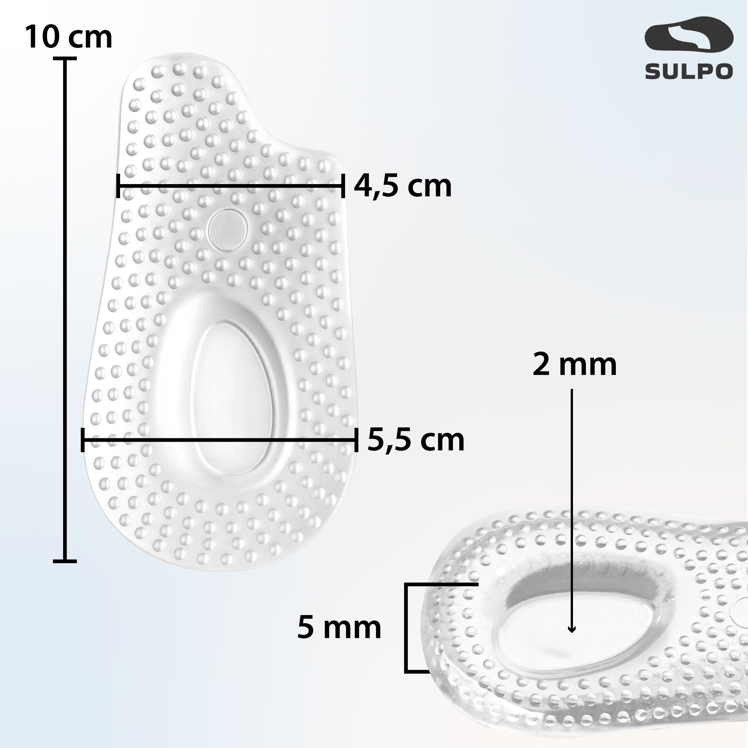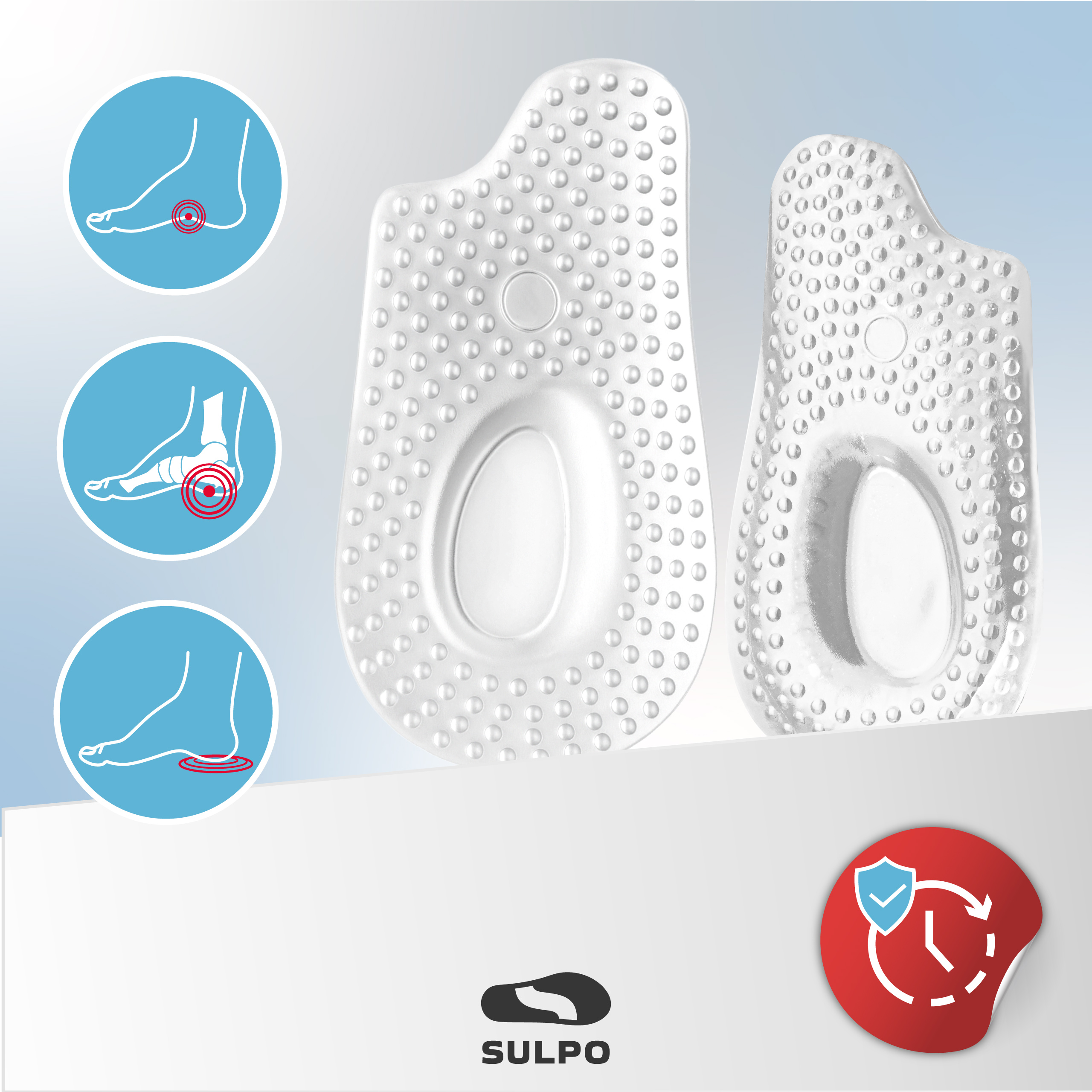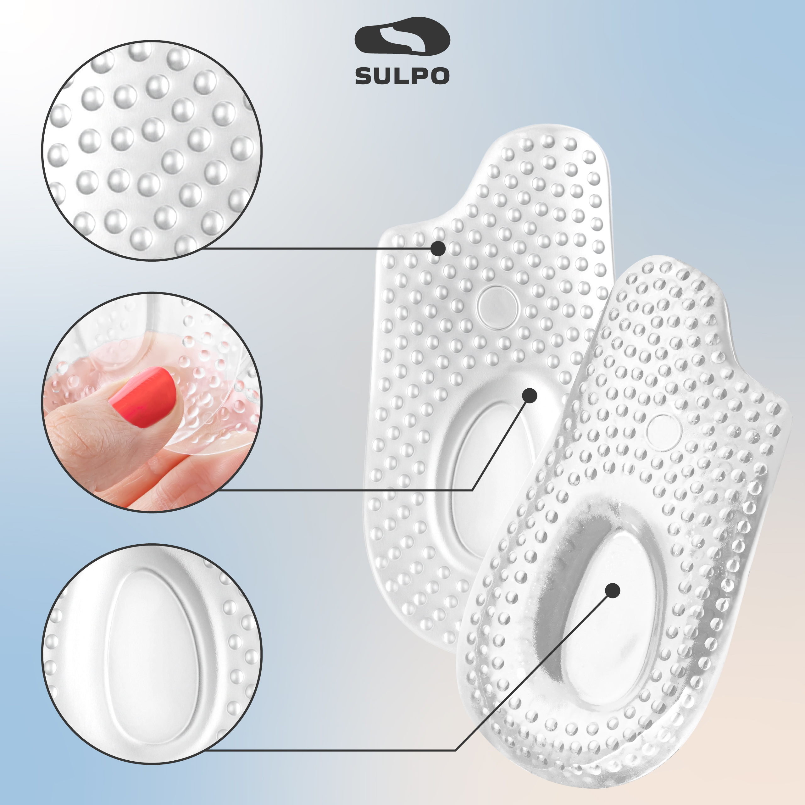 - Żelowe podpiętki SULPO amortyzują każdy krok, odciążają bolesną piętę i zapewniają stabilny, wygodny krok w każdym rodzaju obuwia.
