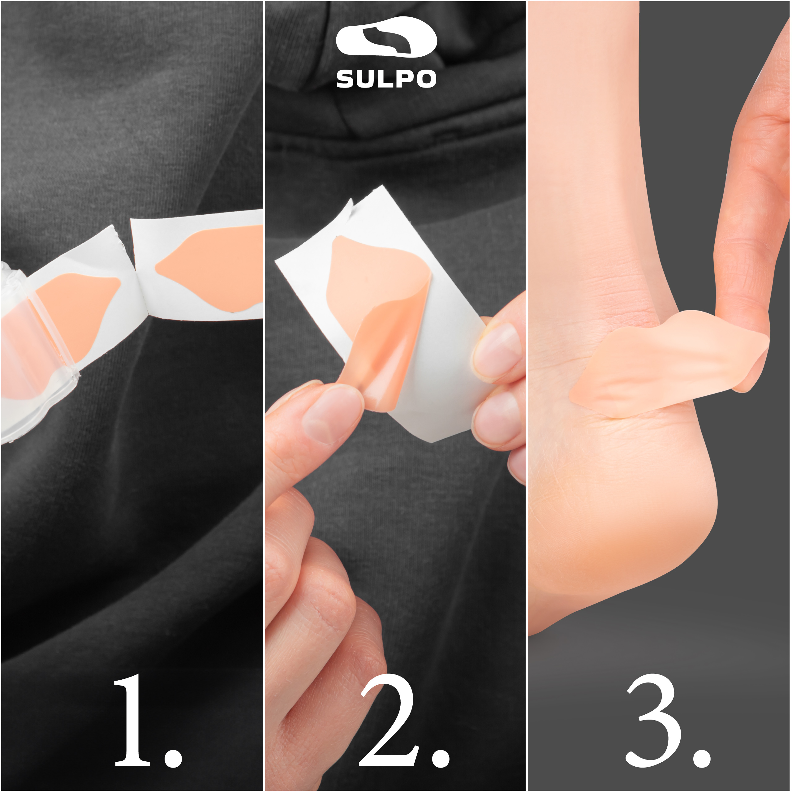 1️⃣ Oderwij gotowy plaster z rolki – bez nożyczek. 2️⃣ Zdejmij folię ochronną. 3️⃣ Naklej na czystą, suchą skórę w miejscu narażonym na otarcia.