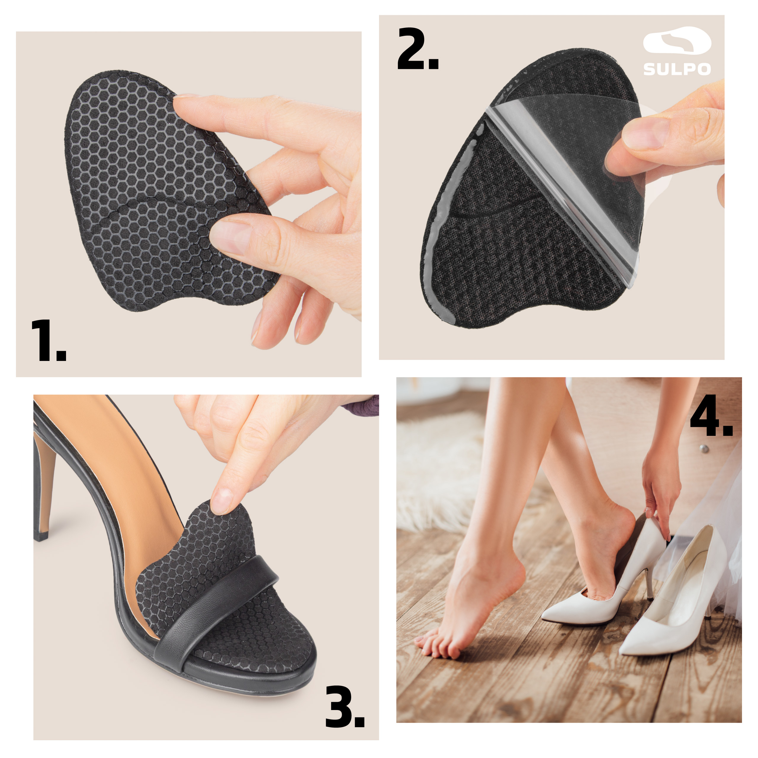 • Samoprzylepne półwkładki do butów na wysokim obcasie, które zapobiegają otarciom i zsuwaniu się stopy, poprawiając komfort chodzenia.