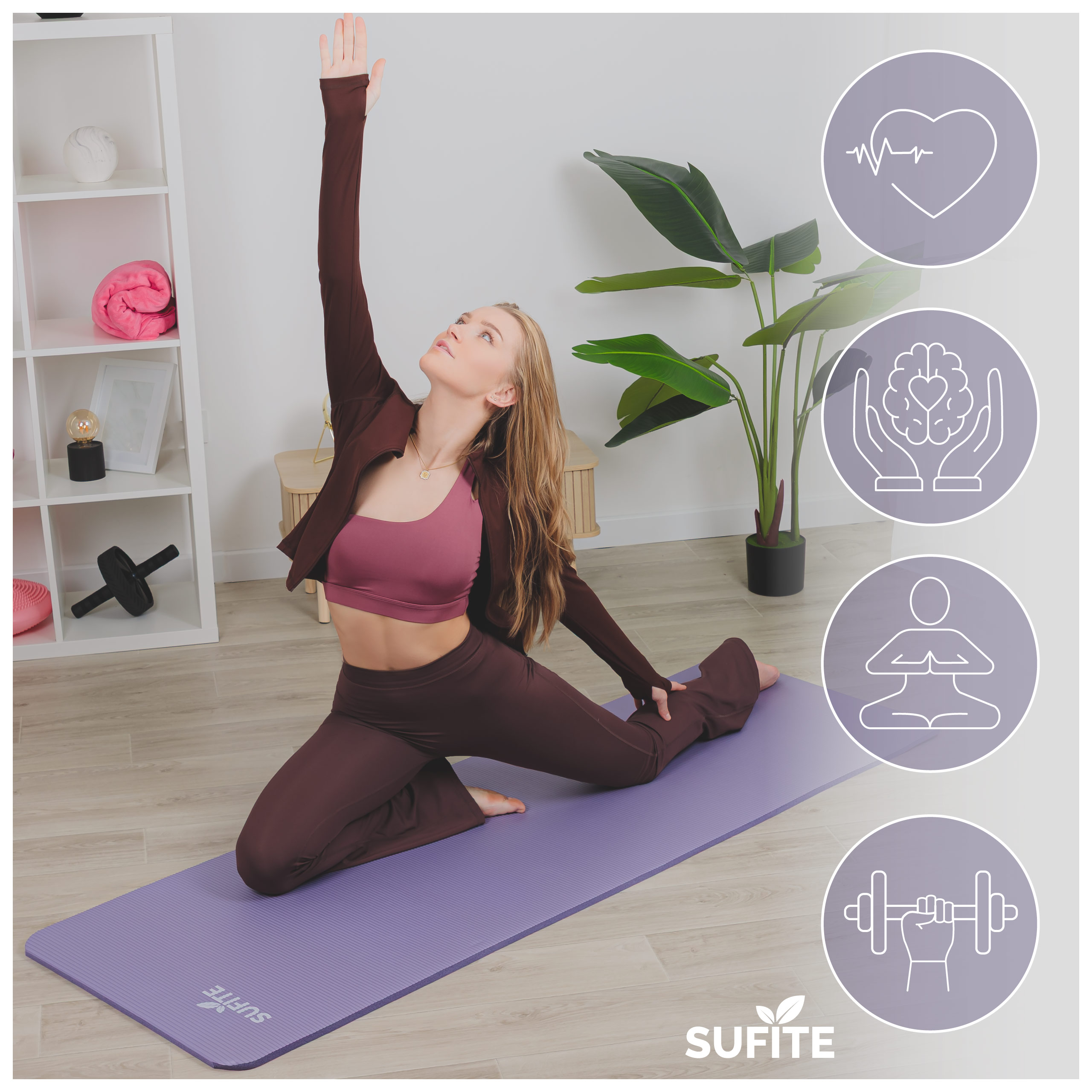 Mata SUFITE oferuje miękkie, bezpieczne podłoże do jogi, stretchingu i ćwiczeń wzmacniających. Dzięki odpowiedniej grubości amortyzuje stawy i zapewnia wygodę nawet podczas dłuższych sesji treningowych.