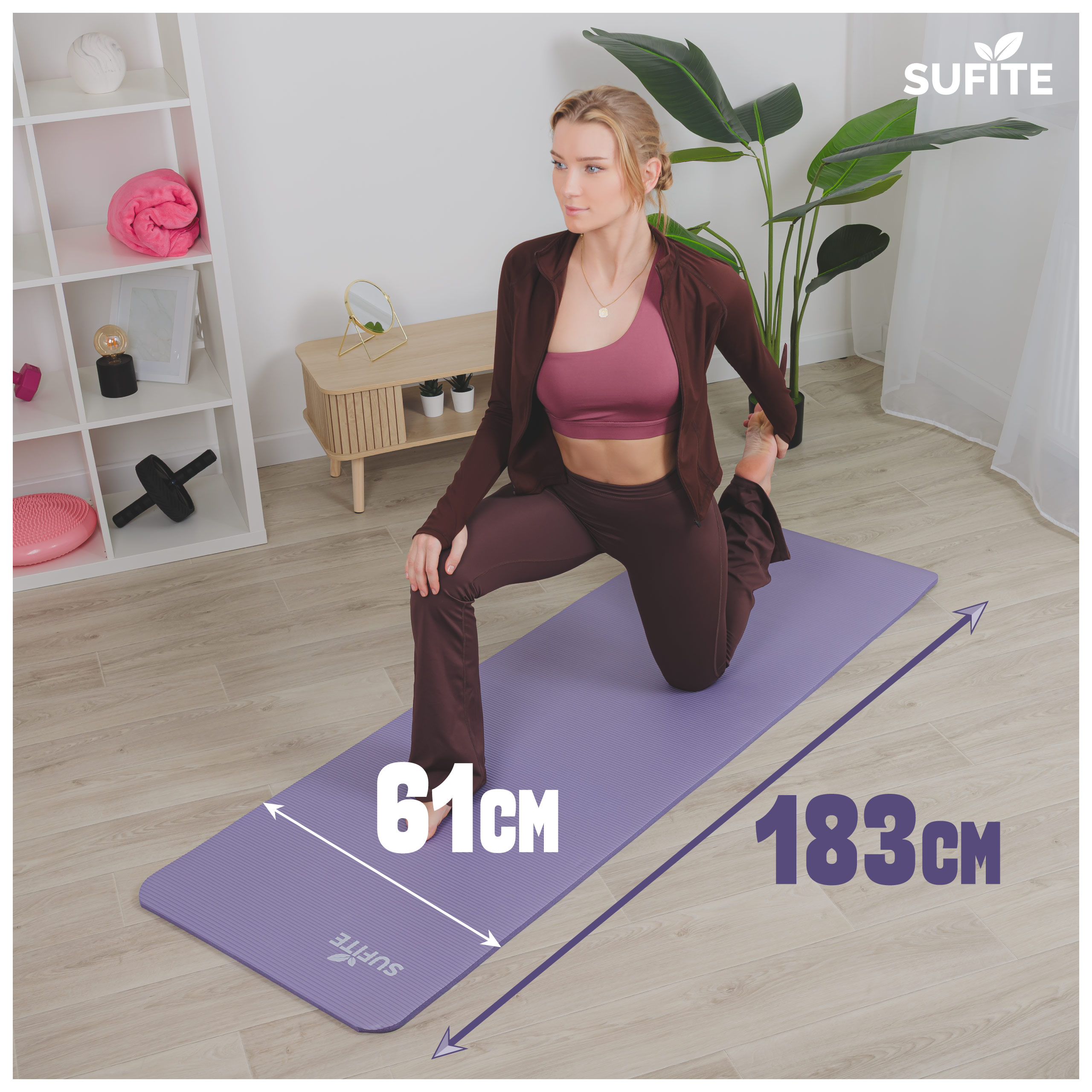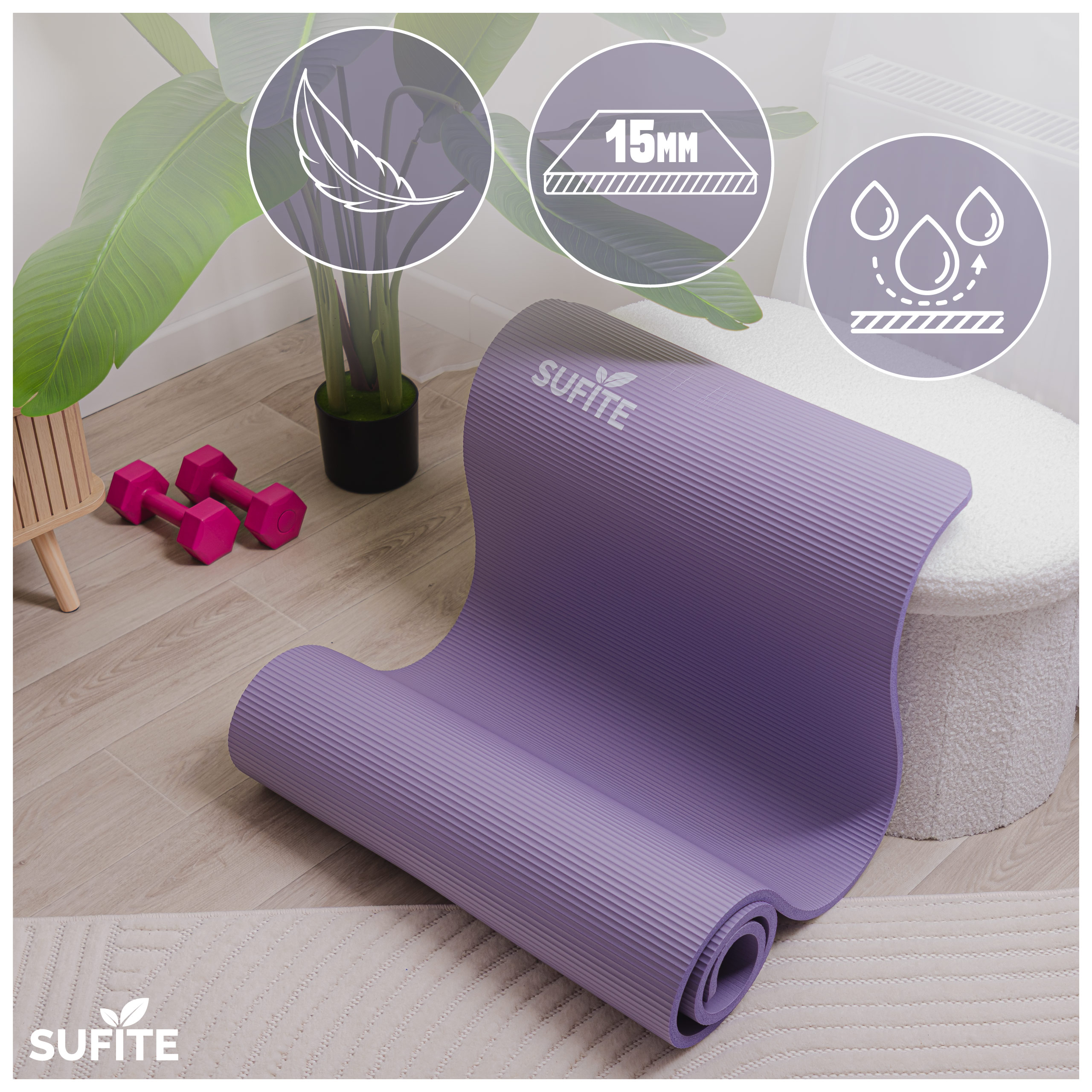 - Gruba mata do ćwiczeń SUFITE z pianki NBR 1,5 cm, przeznaczona do jogi, fitness i treningów w domu lub na siłowni.