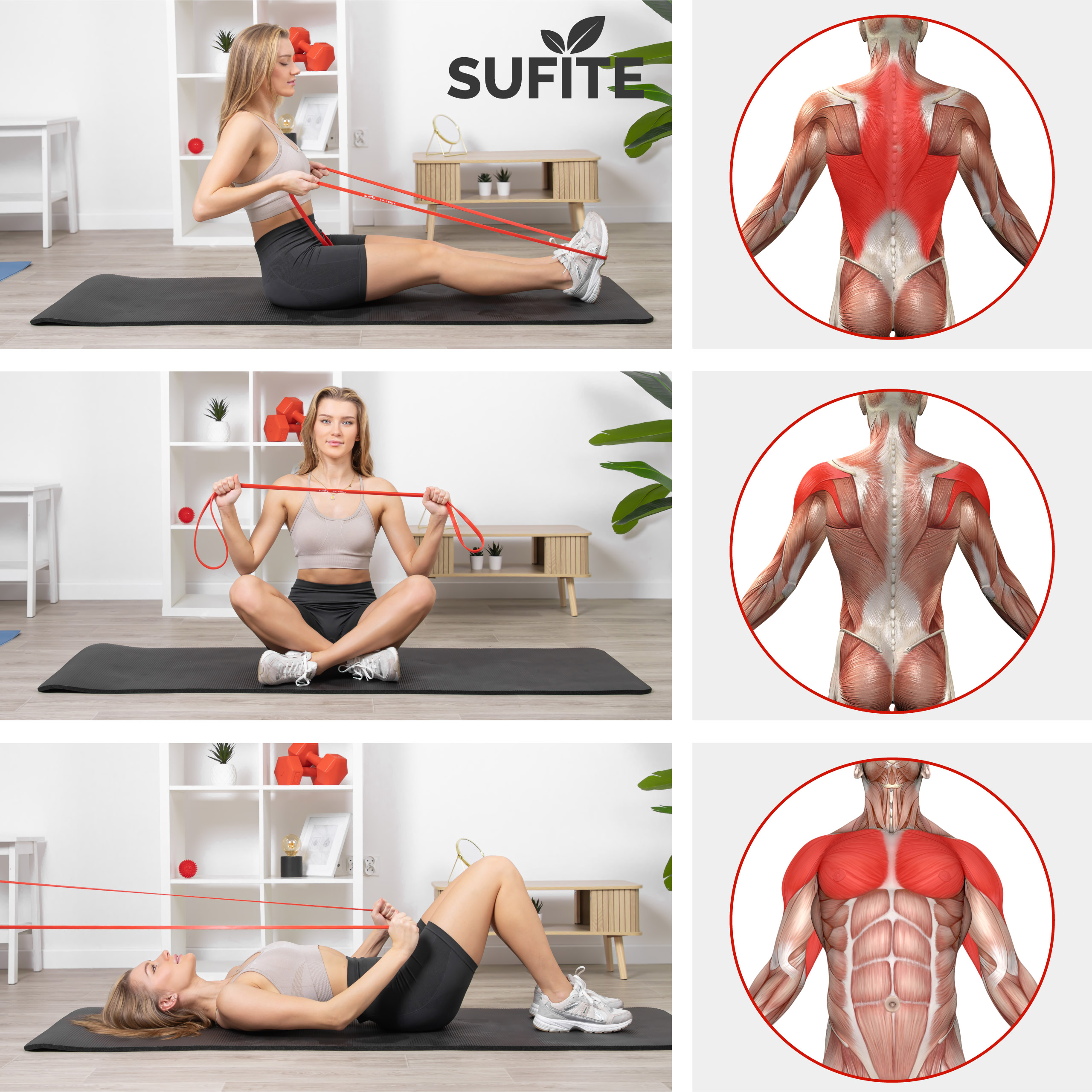 ➤ Guma SUFITE pozwala w łatwy sposób wzmocnić plecy, barki i klatkę piersiową. Wystarczy zmienić pozycję lub kierunek ruchu, żeby zaangażować inne mięśnie.