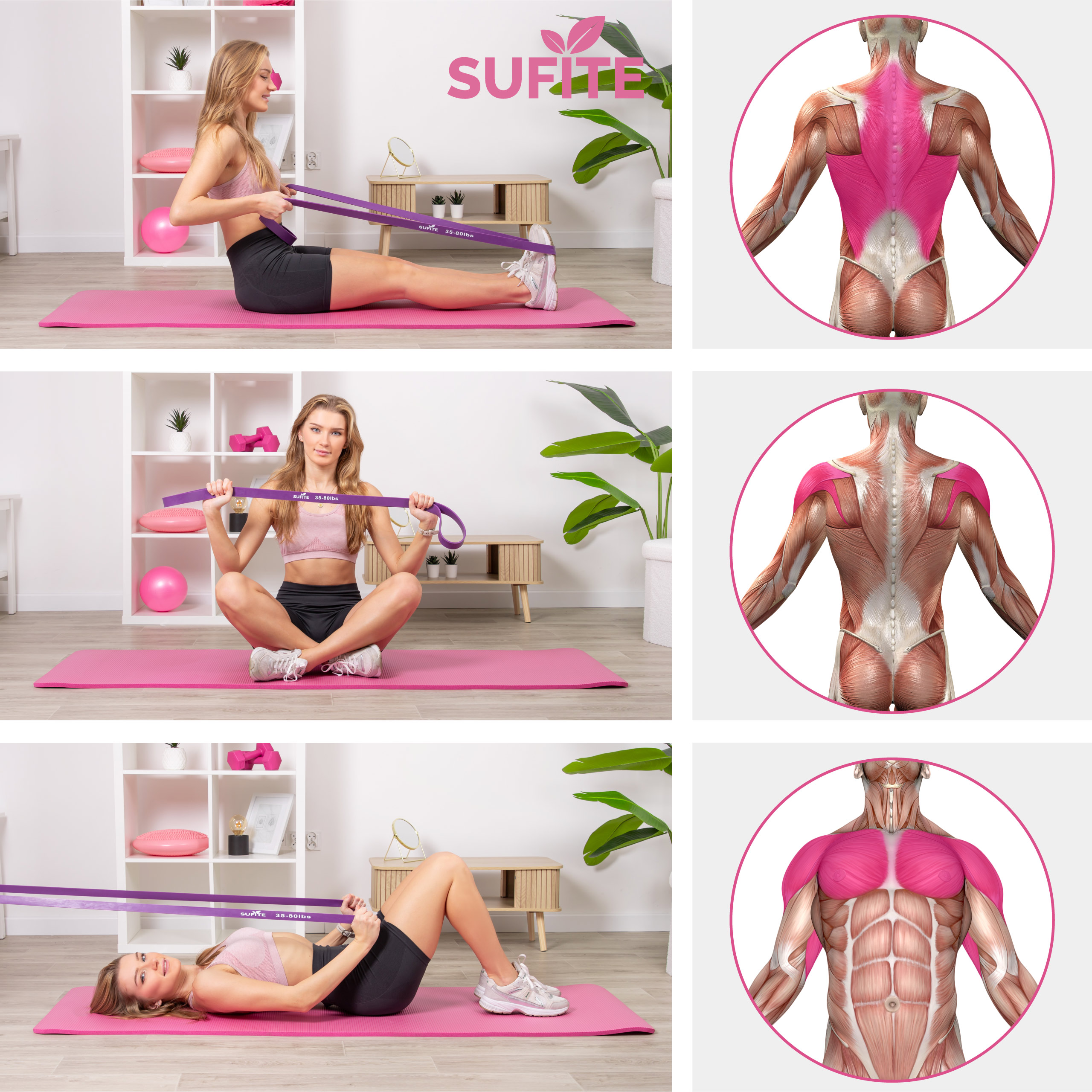 ➤ Guma SUFITE pozwala w łatwy sposób wzmocnić plecy, barki i klatkę piersiową. Wystarczy zmienić pozycję lub kierunek ruchu, żeby zaangażować inne mięśnie.